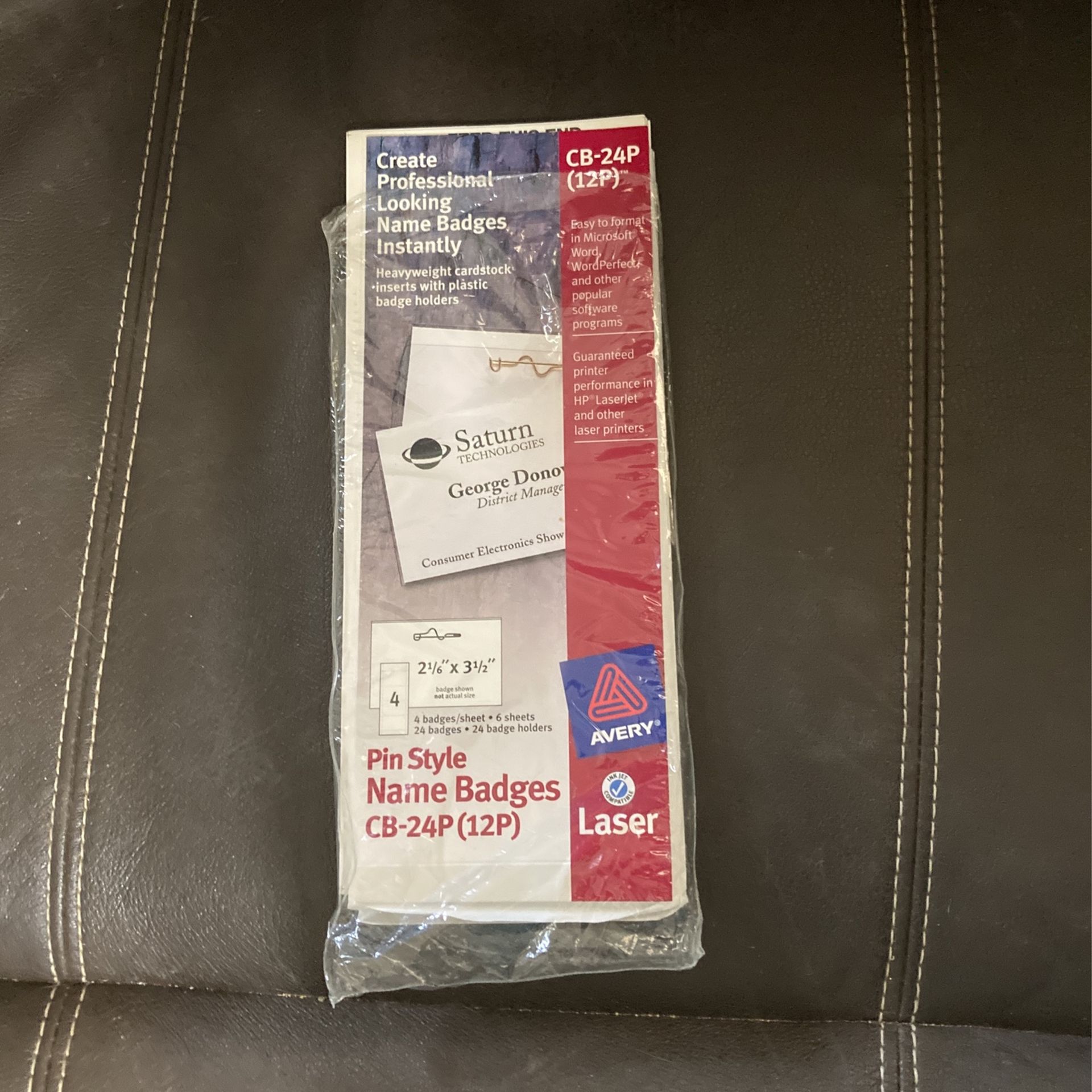 Avery laser pin style name badges. 2 1/16 x 3 1/2 CB-24P in size from estate sale. Packaging is ripped but still there.