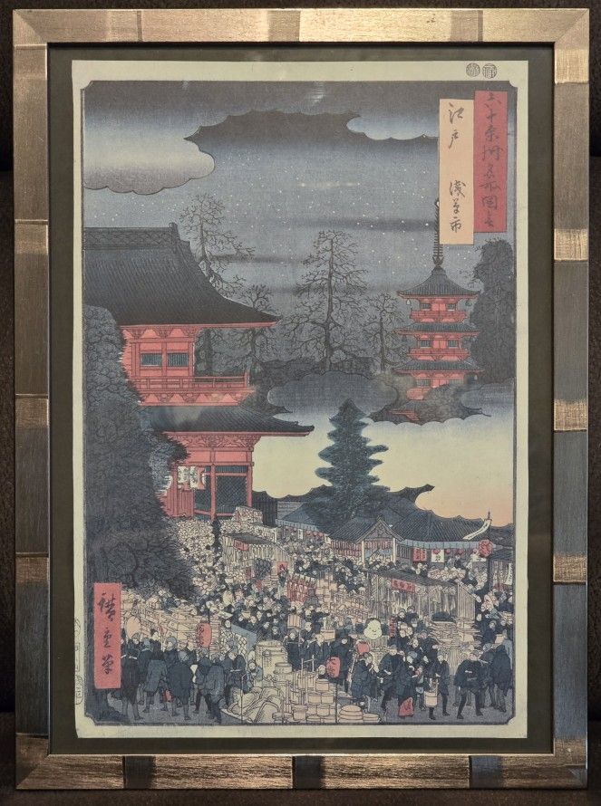 The image is a woodblock print titled "Asakusa Fair, Edo Province" by Utagawa Hiroshige, dating back to 1853. It is part of the series "Famous Views of the Sixty-odd Provinces". Depicts a bustling fair at the Sensō-ji temple in Asakusa, Edo (present-day Tokyo). Features the temple's main hall and pagoda in the background. Shows a crowded street scene with people and stalls. Published between 1853 and 1856. The text on the print includes the series title and location "Edo, Asakusa Fair". It is a celebrated example of ukiyo-e, Japanese woodblock printing.