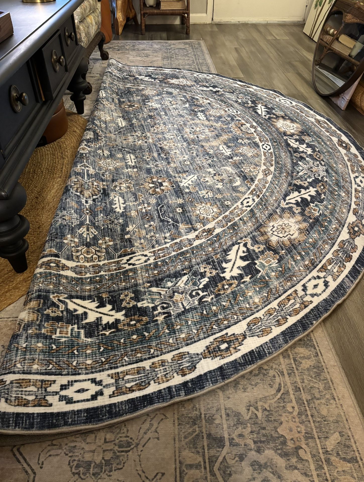 So beautiful, this is new and has nonslip back. Machine washable, low pile. Stain resistant & measures 8ft round. New and great condition! Crossroads, 35th Ave. and Greenway Road in Phoenix
