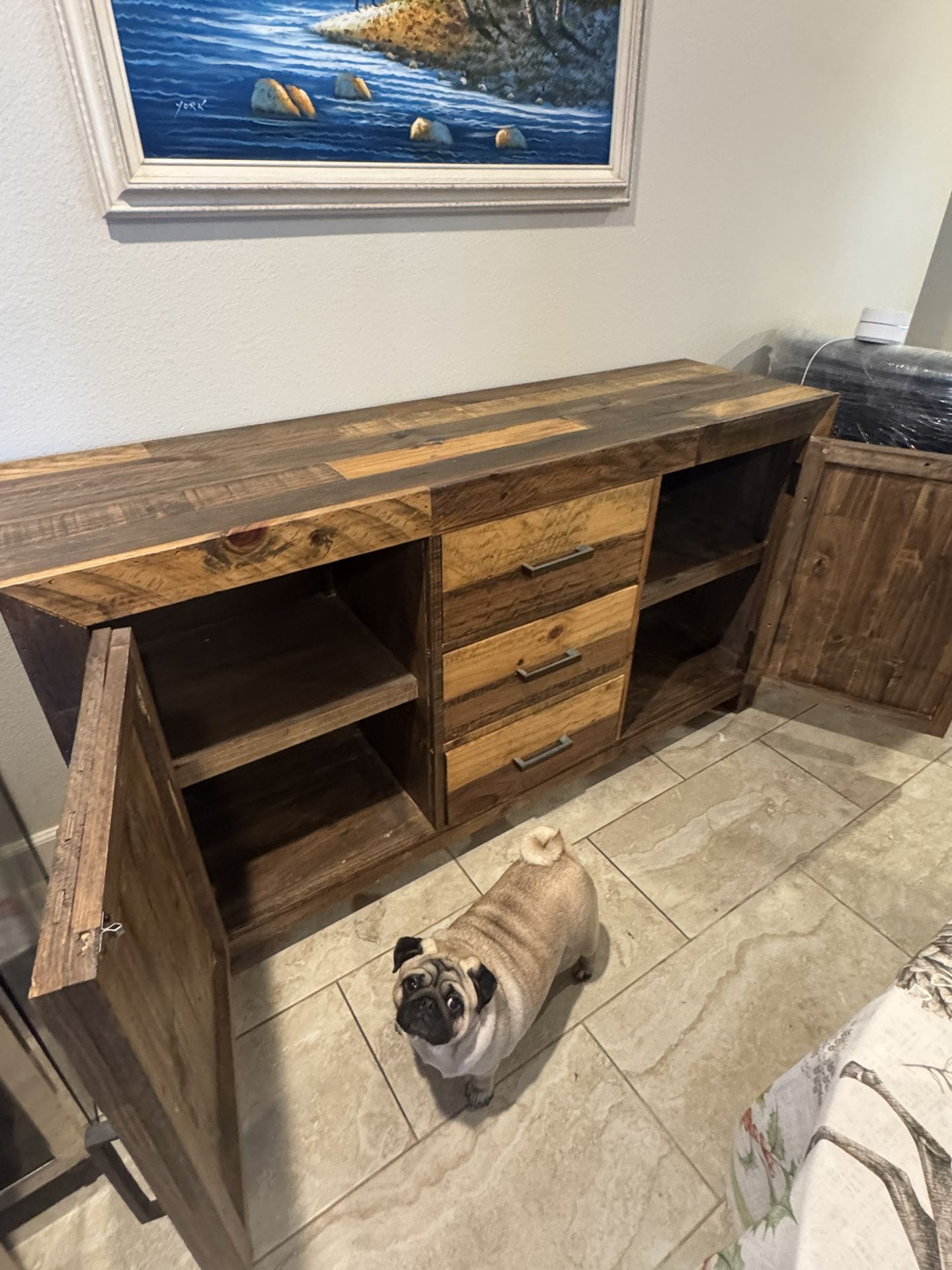 Solid wood buffet, about 8 years old. Only used to store china. Pug not included.