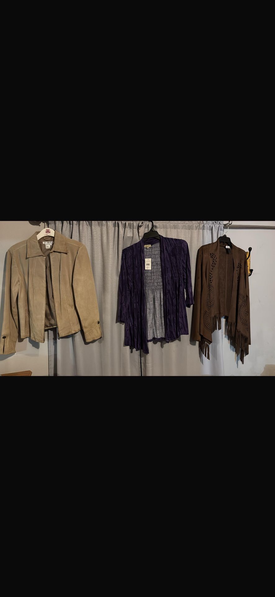 Leather jacket, $25 dls size L, purple cardigan $10 dls and brown cardigan size XXL $8 dls, excellent condition , or all for $30 dls