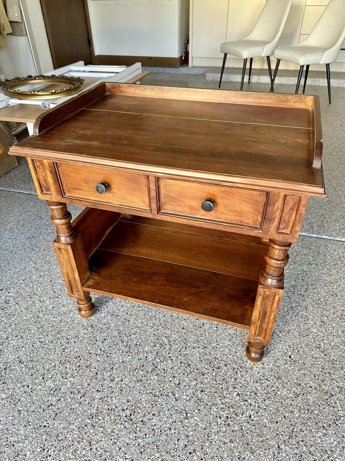 This beautifully crafted antique side table is made from solid wood, showcasing classic lines and enduring quality that only vintage furniture can offer. The piece features two drawers with original hardware and a lower open shelf for added storage or display. Its rich wood grain and warm finish make it a versatile addition to traditional, farmhouse, or rustic décor styles. Has been well loved but still a very sturdy and great piece! Dimensions: L: 28.25” W: 20” H 28”