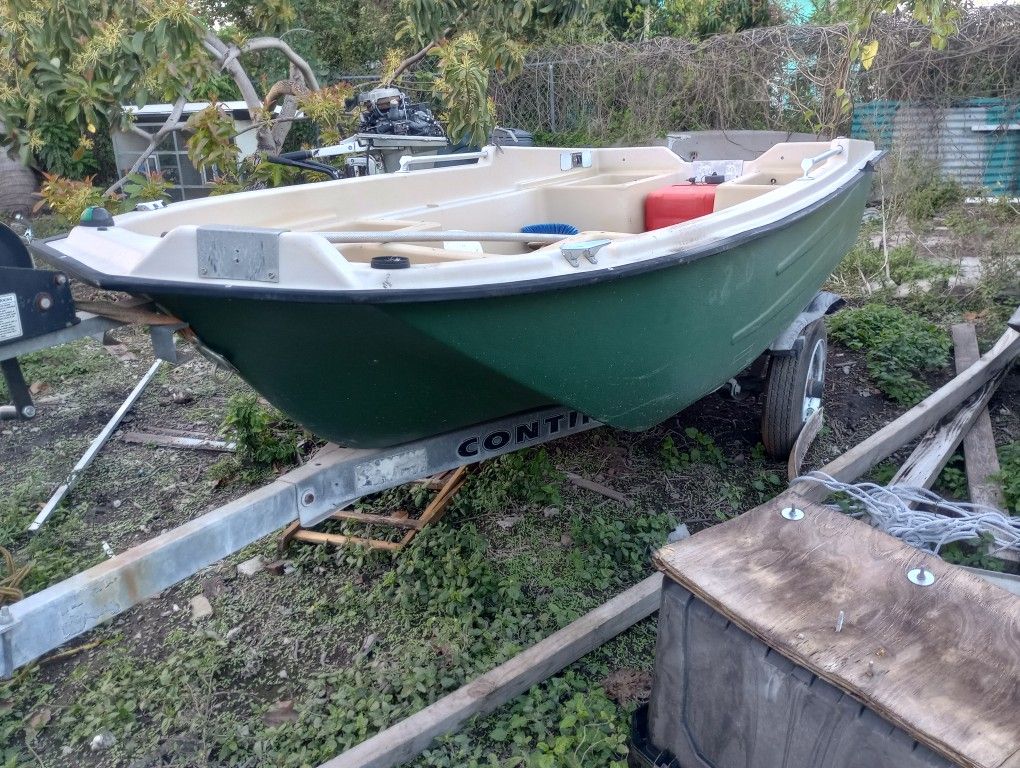 Sun Dolphin Pro 120 is a popular 11.3-foot, two-person fishing boat known for its stability, durability, and features typically found in larger bass boats, such as an aerated livewell and ample storage. It is constructed from rugged, UV-stabilized Fortiflex high-density polyethylene and features a stable tri-hull design. The boat is designed for use on inland lakes and calm waters and is pre-wired for an electric trolling motor. It comes with an outboard engine.