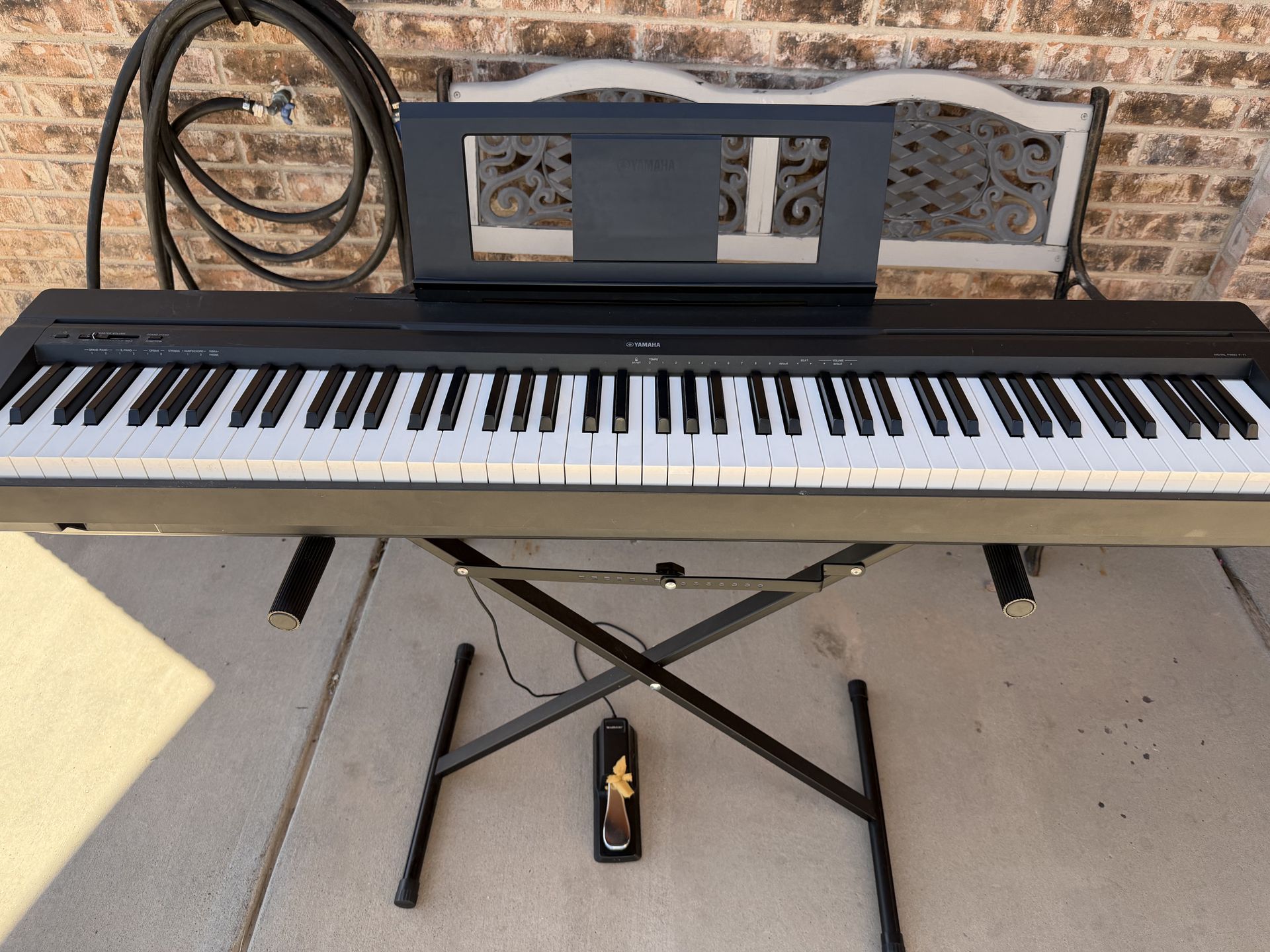 P-71 Yamaha Digital Piano 88-key weighted keyboard 10 unique sounds After market sustain pedal Stand included Power supply included MINOR SCRATCHES Works perfectly and in great condition Sound quality is great All keys work perfectly No sticky keys