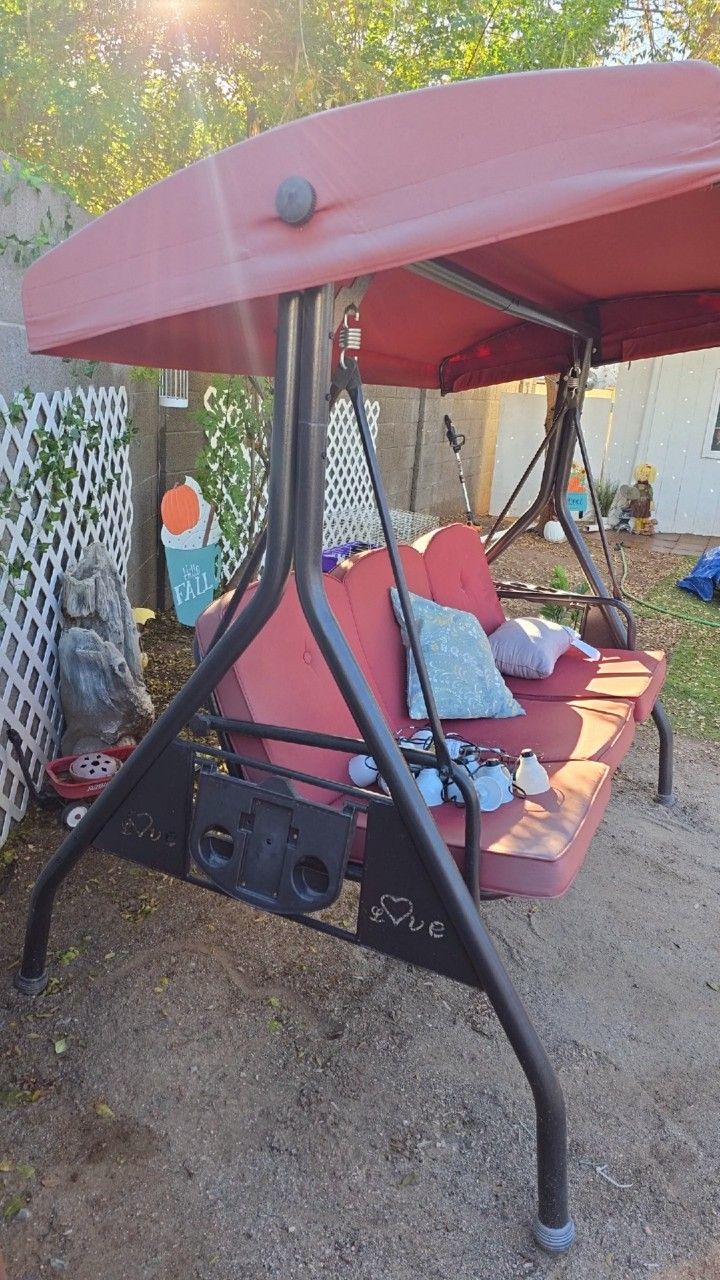 I got this from the home store paid about $500 for it last summer there are no rips no tears it either sits up and swings or lays back as a bed and locks there are cup holders and phone holders this thing is very sturdy like I said there's no damage I've only had it for one summer got it the Christmas before last