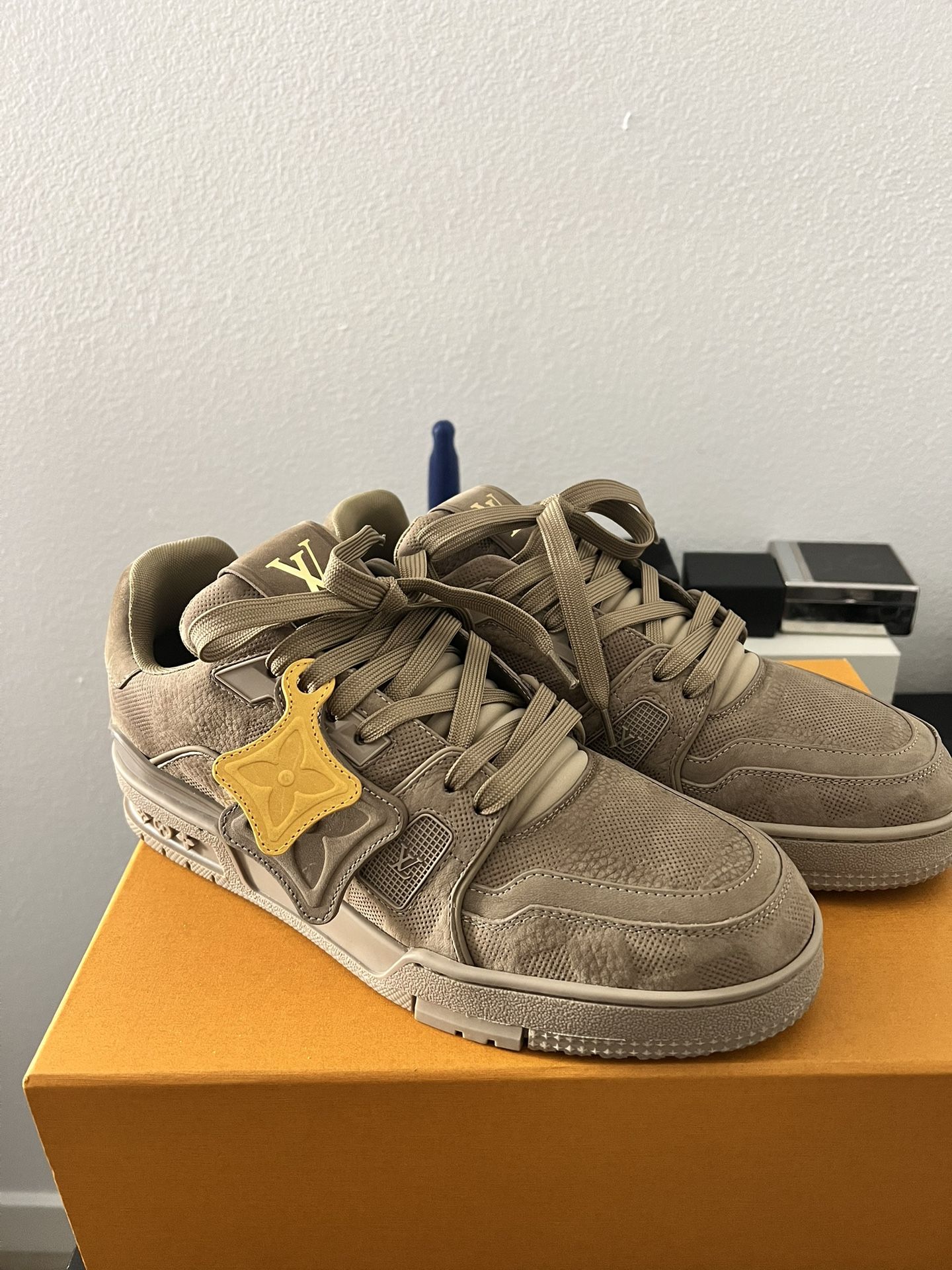 Didn’t want to sell but I can’t return them so…. Managed to get these at the Louis Vuitton store in Hong Kong : Store address: 5 Canton Road, Tsim Sha Tsui They didn’t have a size 8 so I got a 8.5 US which is a half size bigger on me because these trainers run big so they feel like a 8.5/9 US. I’ve worn them out once because I was unsure on selling but I rather a smaller size for a more snug fit …so letting them go. These are a UK 7.5 - US 8.5 - EU 42 Everything that came in the packaging included Sold out online in US :( Color: Taupe (a grayish brown)