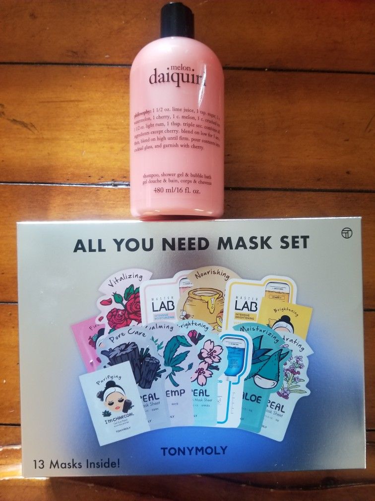 New! Large bottle of philosophy melon daiquiri & Tonymoly face mask gift set with 13 masks. All have great reviews. The face masks retail for $3 to $4 a piece.