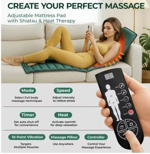 Full Body Massage Mat with Heat, Detachable Massager Pad Deep Tissue Pain Relief,10 Vibrating Motors & 9 Speed Settings for Home / Office Use