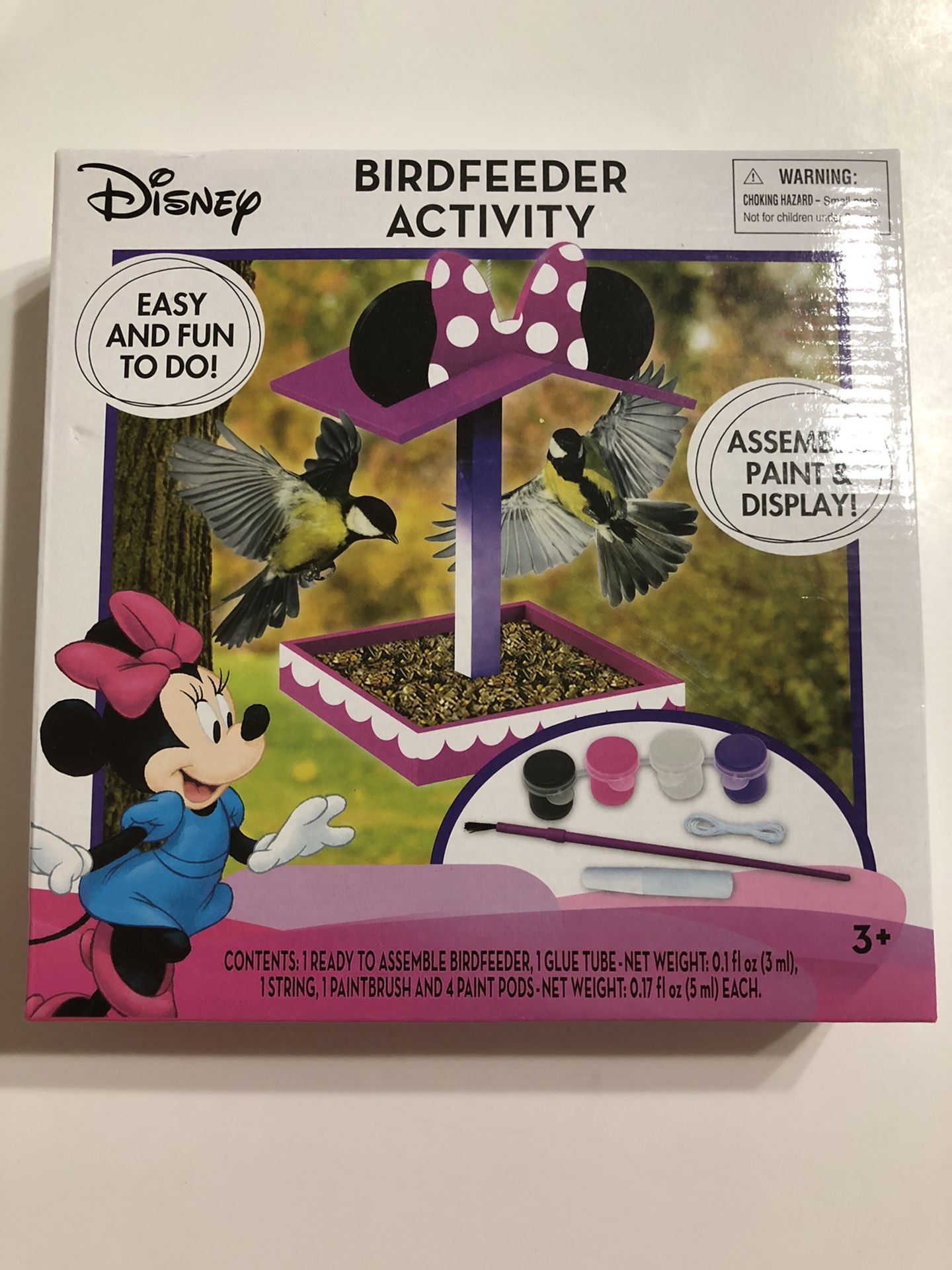 DISNEY MINI MOUSE BIRDFEEDER ACTIVITY KIT ASSEMBLE PAINT & DISPLAY NEW Easy and Fun To Do! Contents: 1 Ready to assemble Birdfeeder 1 Glue Tube 1 String 1 Paintbrush and 4 Paint Pods Not for children under 3 years