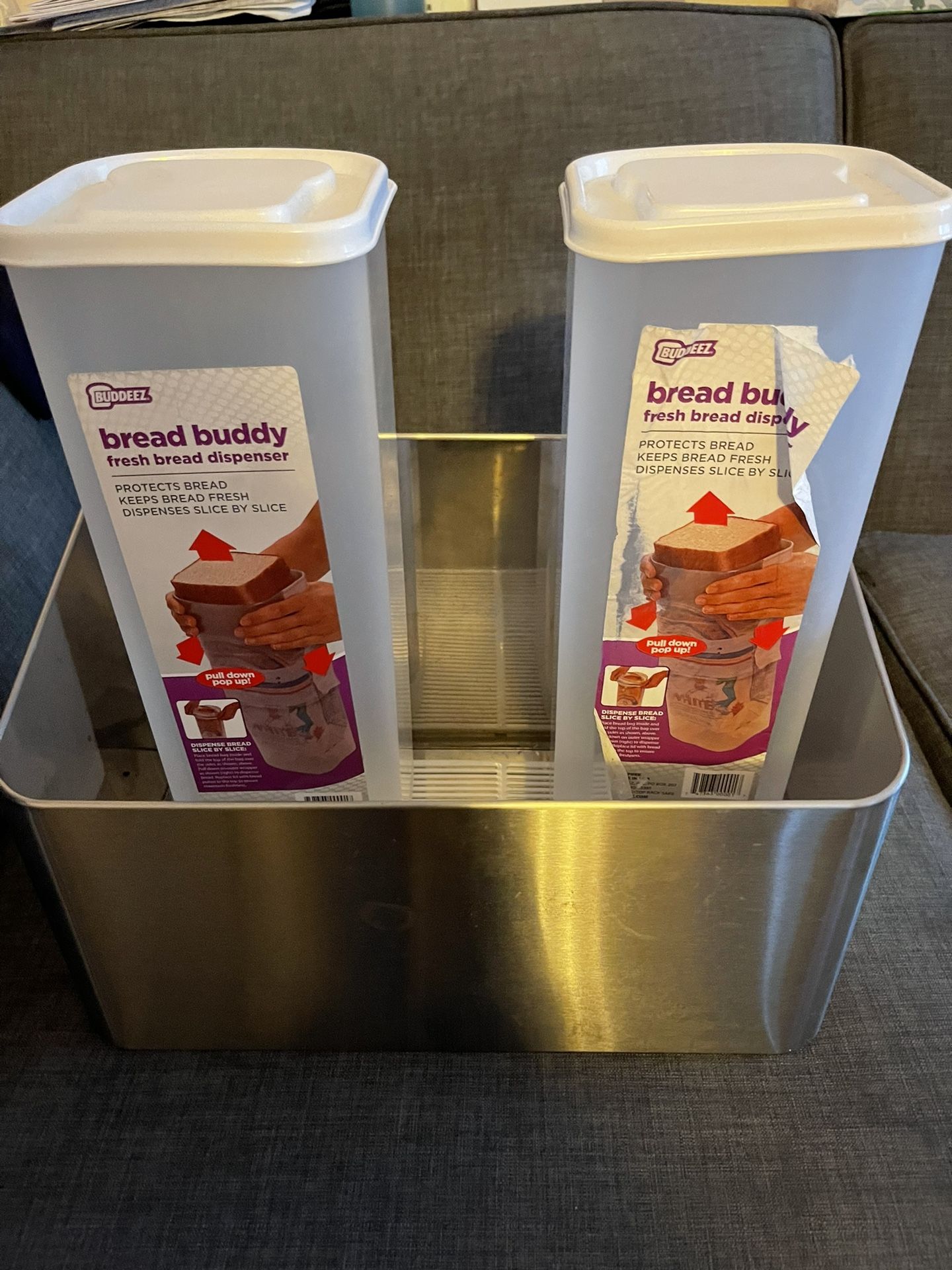 Two bread buddies to owe bread fresh longer and a metal bread bin. Used to have a cover on it but removed it so I could save counter space and have it sit upright. Reorganized and don’t need them, though the bread buddies work great. My family just won’t use them and they clutter up my space.