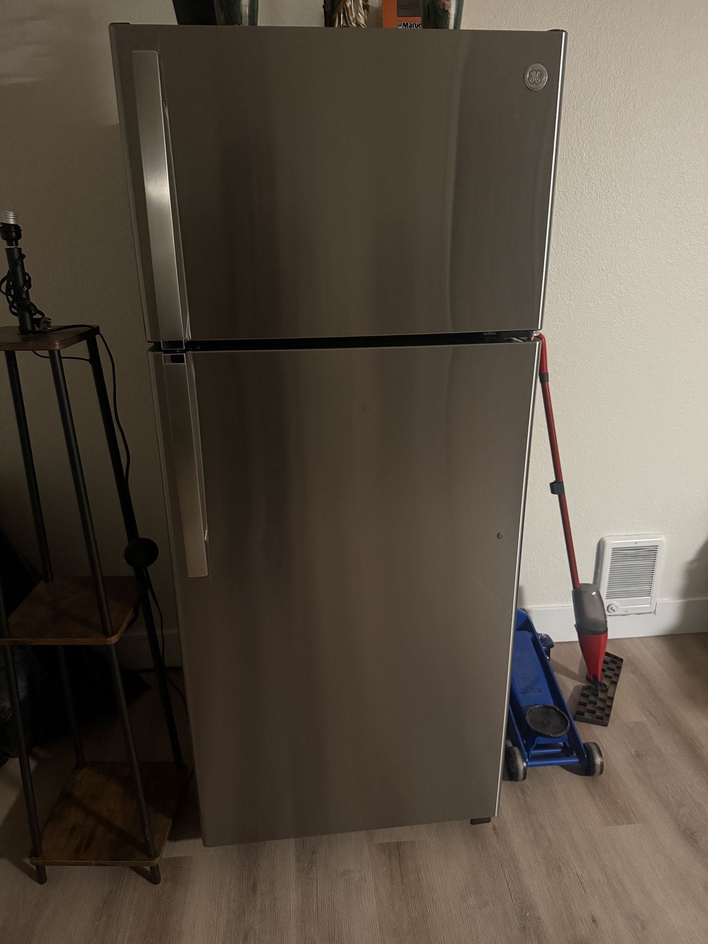 GE stainless steel refrigerator in excellent condition. Only 3 months old. Works perfectly — cools and freezes 100%. Original price was $1,100. Selling because we no longer need it. Has a small cosmetic scratch (see photos), nothing that affects performance. Practically new. Ready for pickup. Price negotiable. Cash only. Pick up only.