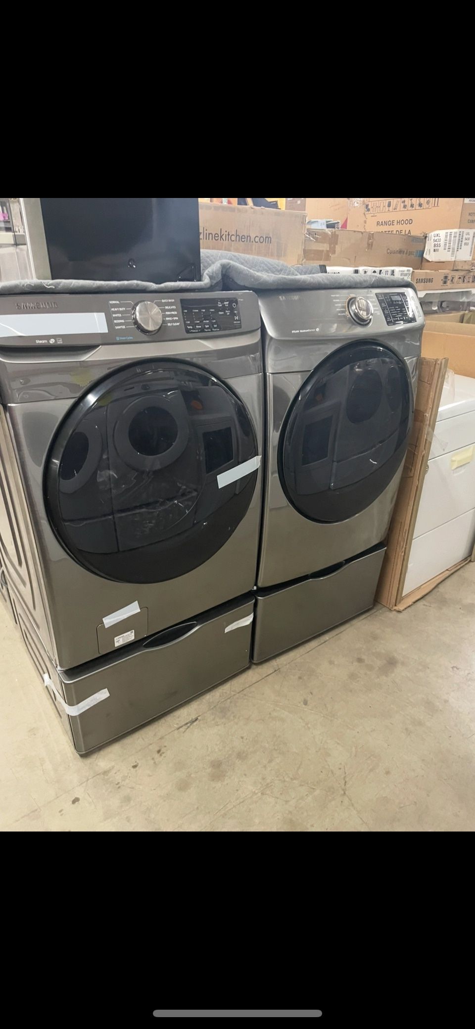 Steam set front load washer and gas dryer steam Samsung stainless steel w 27” Include the pedestal Never used only cosmetic minor scratches and little dents Serious buyers Serios compradores