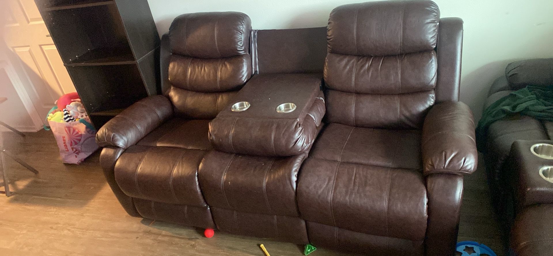 $ 400 OBO - 2 Dark Brown recliner couches - 1 couch has 2 seats with table and cupholders in the middle along with 2 speakers that are bluetooth compatible and 2 charging ports. Both couches also have lights on the bottom that you can turn on. The other couch is 3 seats with the option to put the middle seat down as a table with 2 cupholders. Lastly the recliner chair is also a rocking chair very comfy I used it for my first year with my baby. The dark brown bookshelf is nice size with large shelf space. NEEDS TO BE GONE THIS WEEKEND ALL FURNITURE IS VERY LIGHT. OBO message me to make an offer!! :)