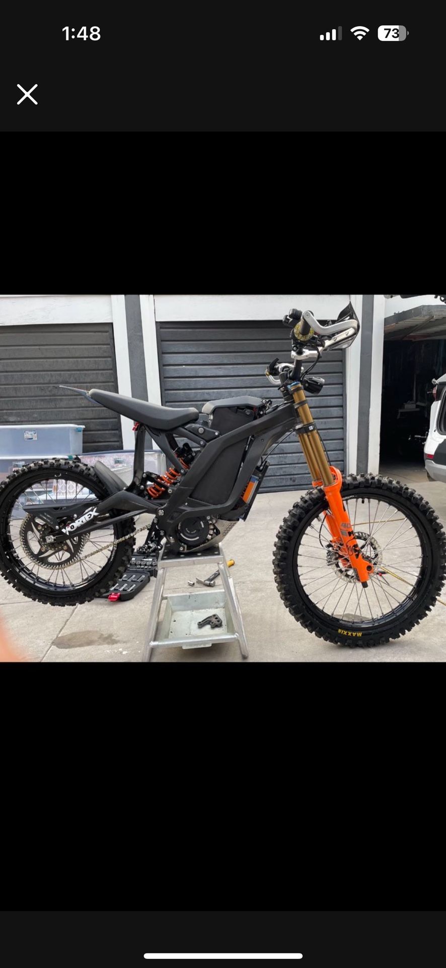Selling my Sur Ron. DM me if interested. Fox 40’s 2023 Fox rear shock Gladiator Battery 60v Brand New D.I.D built rims with moto X spokes Pro Taper Handelbars Magura MT7 brakes and discs BAC 400 with eggrider controller Warp suspension mounts Undercarriage reinforced plate Luna rear Sprocket. Many other smaller mods.