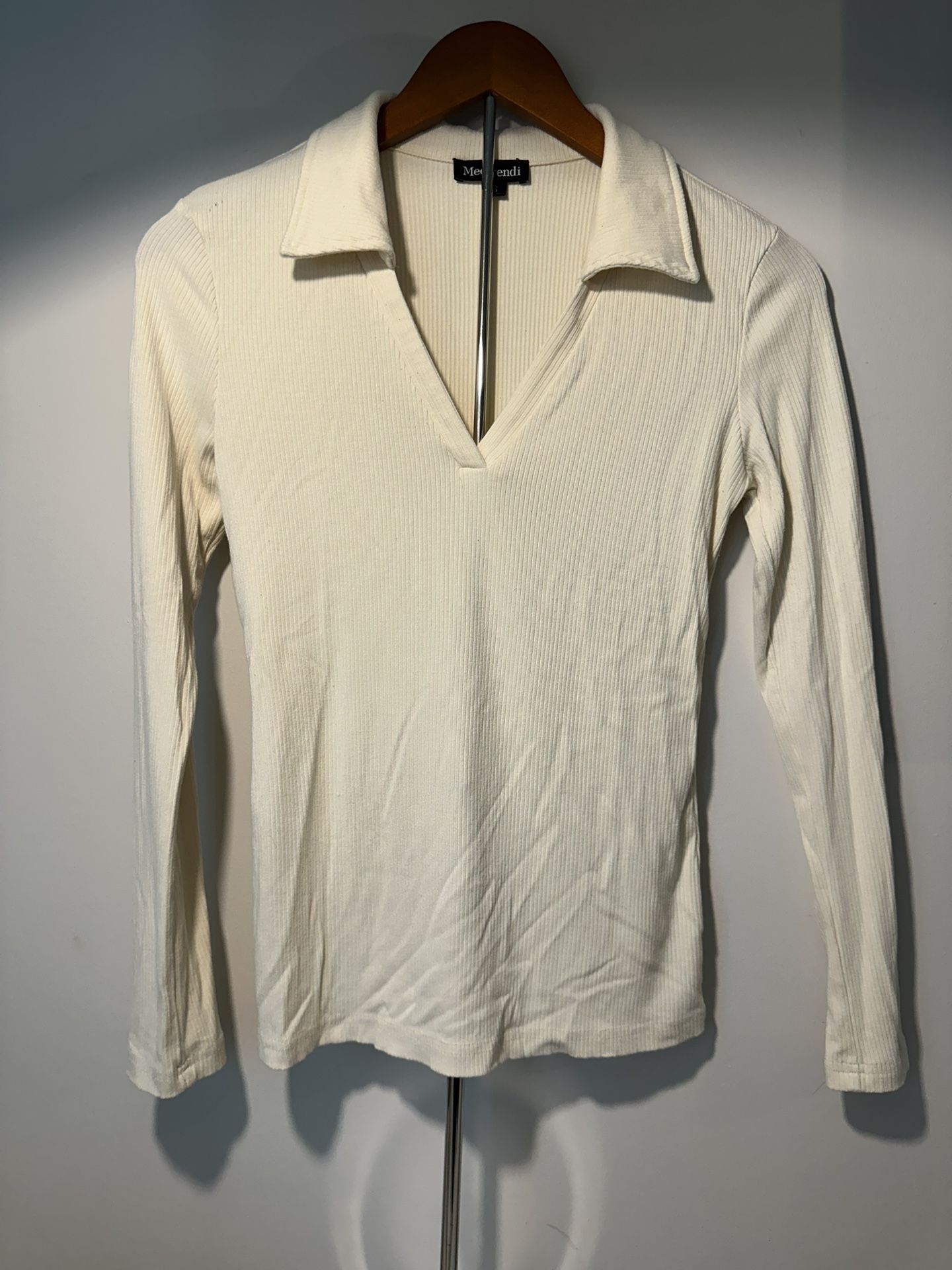 Meeirendi Ribbed Long Sleeve Collared Top Size Small – Cream Stretch Knit Shirt