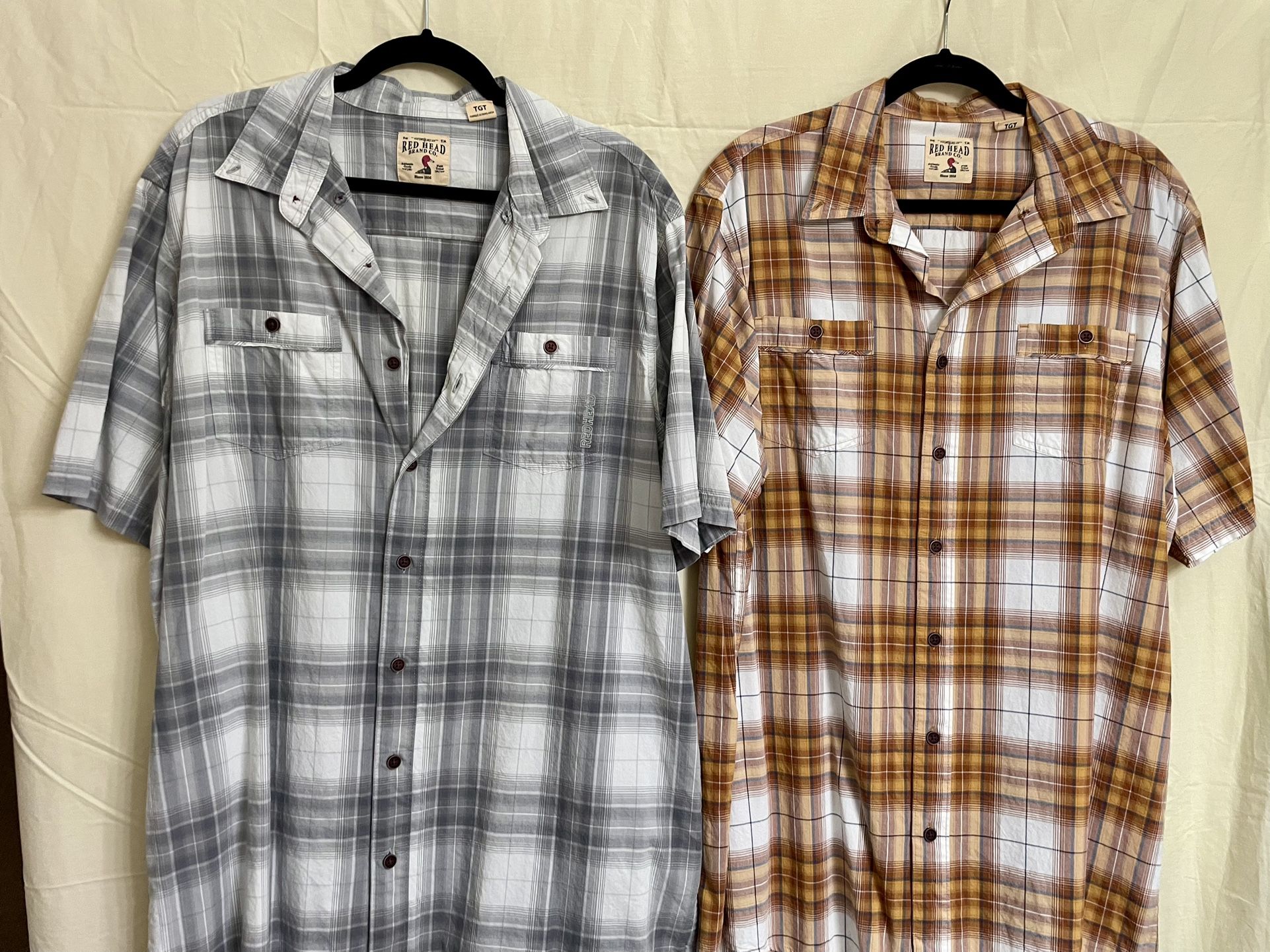 Men’s redhead brand company short sleeve button up shirts includes two plaid shirts in the color of gray and tan/brown tall fit great for taller guys comfortable breathable shirts, perfect for casual or out door wear. In extremely good condition, no holes nor damage smoke free home.