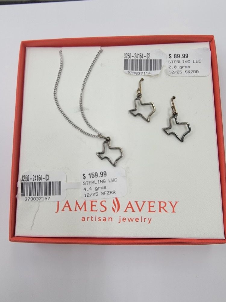 Hi I'm Trinity, I'm located at the Cash America Pawn Shop at 11643 SE Loop 410 Acc Rd, San Antonio, TX 78214 and I've got some great items in stock just for you! For now today I have: This item is a set of James Avery Texas-themed sterling silver jewelry. It can be a set or separate. Price is negotiable. Earrings are 2 grams and the necklace is 4.4. Earrings are 90 and necklace 160 if separate.