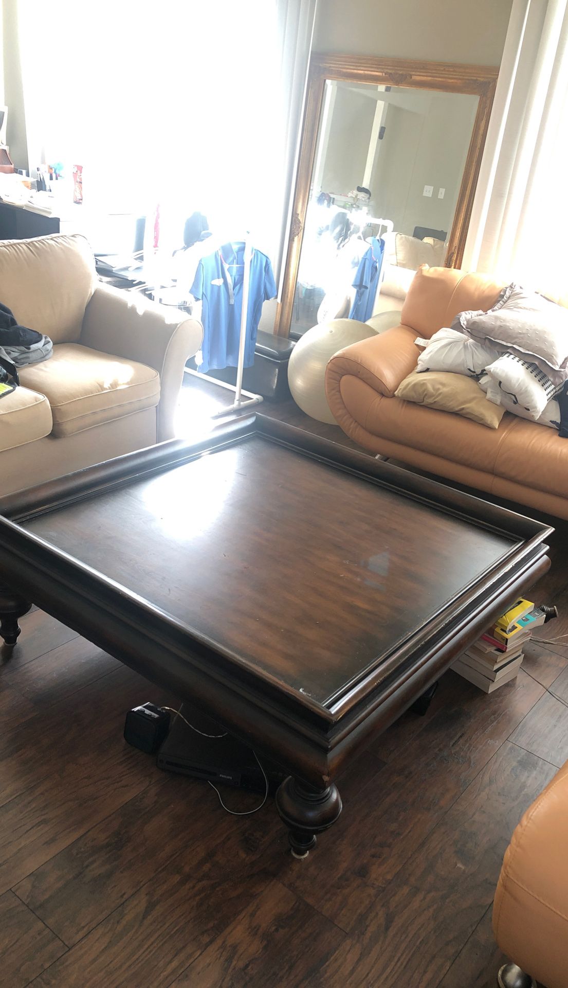 Dark espresso oak color Coffee table SqUare table Minor scratches here and there One leg is detached but not broken. Just have to put it back in and stabilize but no issue