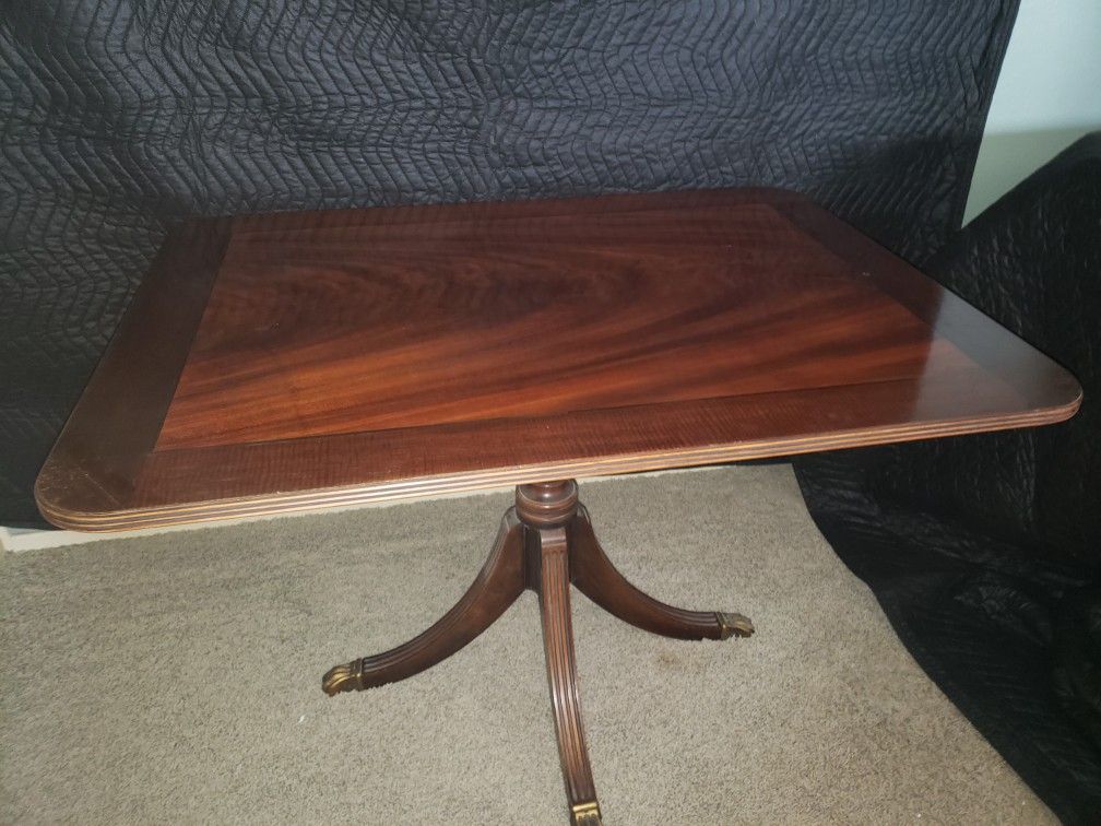 Vintage pedestal table with gorgeous polished wood grain finish. Tabletop is mounted to pedestal with dowel hinge, secured with screws, allowing you to fold up the table for storage. 40" L × 30" W × 26 " H (47-1/2" folded up)