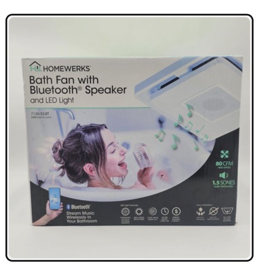 Elevate your morning with the 80 CFM Homewerks bath fan with Bluetooth speakers. This bath fan will efficiently clear moisture in rooms up to 80 square feet. At 1.5 sones, you'll be able to hear every word of your current favorite song or pod cast. Your sing along voice won't be the only thing left to brighten your bathroom's atmosphere, however. This bath fan also comes with an integrated downright that delivers 800 lumens of cool white light (4000K). Make bath time a little more enjoyable for your or your family with Homewerks Blueooth ventilation fan. 80 CFM Bluetooth® bath fan from Homewerks® Integrated LED downright delivers 800 lumens of 4000K cool white light Stream music wirelessly in medium sized bathrooms up to 80 square feet Connects to most Bluetooth® wireless technology enabled devices, such as smart phones, tablets, and laptops After initial set-up, your device pairs automatically when in range of speaker (up to 30 feet away) Mounting hardware included Galvanized steel construction resists corrosion, includes quick connect wire connectors for easy installation UL certified and HVI listed 3 Year limited warranty on fan, 1 year limited warranty on speaker