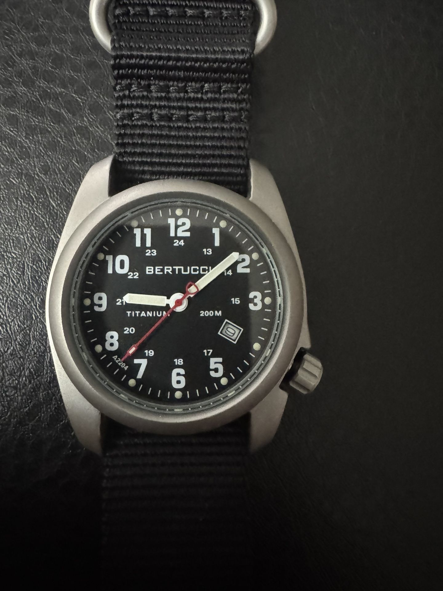 • Bertucci A-2T Black Dial Titanium Watch• • Movement:Precision quartz analog (battery powered) Case:Sandblasted titanium, 40mm x 13.5mm thick. Back:Solid back Crystal:Hardened Mineral Band:Black nylon, buckle closure. Water Resistant:200 meters• • Watch is new without box or papers • • No trades! No shipping! No lowball offers!• • Thanks for looking!•