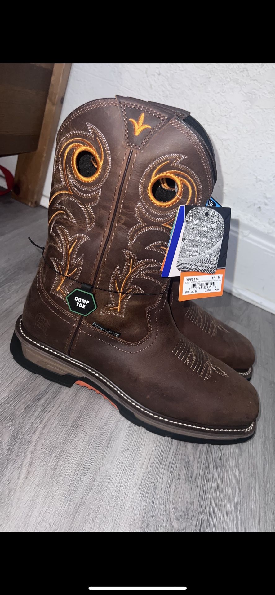 BRAND NEW Dan post work boots. Size 12M Composite Toe Eletrical hazard Air flow insoles 11” high pull on boots Waterproof