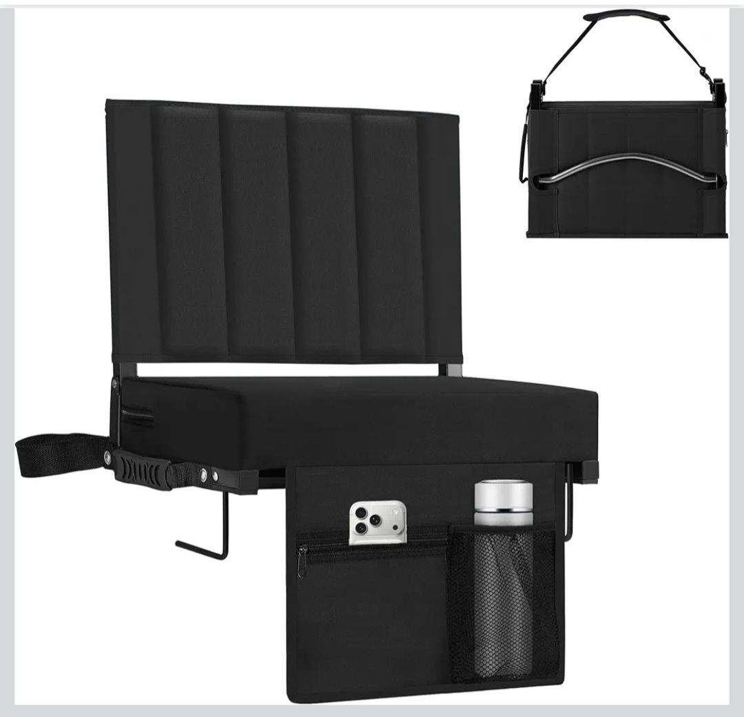 Stadium Seat for Bleachers with Back Support, Portable Bleacher Seat with Wide Comfy Padded Cushion, Metal Hook, Folding Stadium Chair with Shoulder Strap, Carry Handle, Cup Holder Ergonomics Design: The stadium seat cushion with back is designed with generous dimensions, measuring 13'' D × 17'' W × 15.4'' H. It is accompanied by a plush seat cushion containing soft foam, ensuring a comfortable sitting posture. Featuring vertical stripes and sturdy metal rod contoured to fit the back's curves, it effectively reduces back and waist pressure during extended periods of watching Safety Assurance: The bleacher chair boasts a robust weight-bearing capacity of up to 400 lbs, suitable for a diverse range of individuals. The bottom features 2 steel hooks, further enhancing stability during use. Additionally, there are 2 storage pockets at the base, each equipped with elastic bands and zipper closures, allowing you to securely store belongings, freeing up your hands Premium Quality: Our seat is odor-free and constructed with a rust-resistant metal frame and high-quality 600D Oxford fabric, ensuring durability. The Oxford fabric is seamlessly stitched, sturdy and easy to clean—simple daily maintenance requires only a damp cloth. The seat's bottom features thickened anti-slip rubber strips that can be reused, effectively protecting both the metal and the floor from scratch. Tip: Regular cleaning is advised to keep the surface dry, extending its lifespan