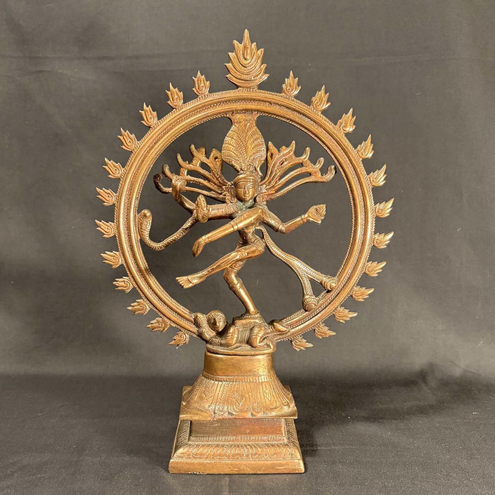 Vintage bronze sculpture of Nataraja, the Hindu deity Shiva in his role as the cosmic dancer surrounded by a ring of flames, representing the cosmos, as he performs his divine dance of creation and destruction. Has the number 56 on the back (56 Bhog?). Metal is either bronze, copper, or copper plated brass - otherwise unknown type of metal. Home altar, spiritual art. Approx. dimensions in inches: 13H x 9W x 3D. (B1)