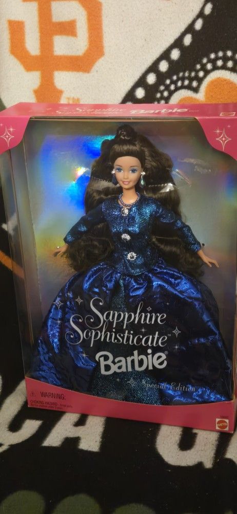 1997 Sapphire Sophisticate Barbie Doll. Barbie is dressed in a blue dress and has long brown hair. Never opened original, clear plastic box.
