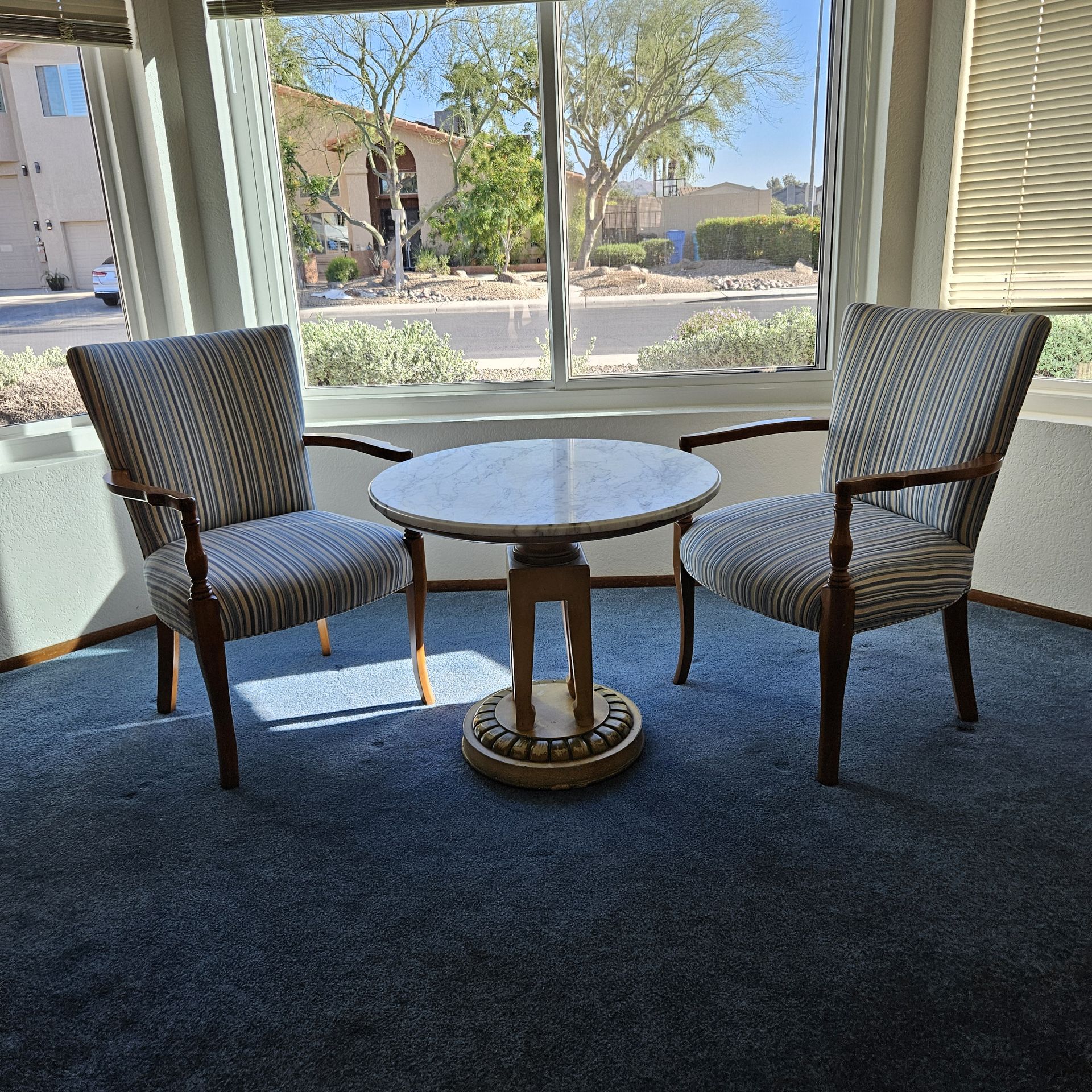 Herndon marble table and two chairs in excellent condition. Features markings "STYLE 9768" and "ITALY" stamped on the underside of marble top. 28" diameter, 24" tall. All three pieces $1,900.00 dollars. Crossstreets: 44th Street South of Greenway Road, Phoenix 85032.