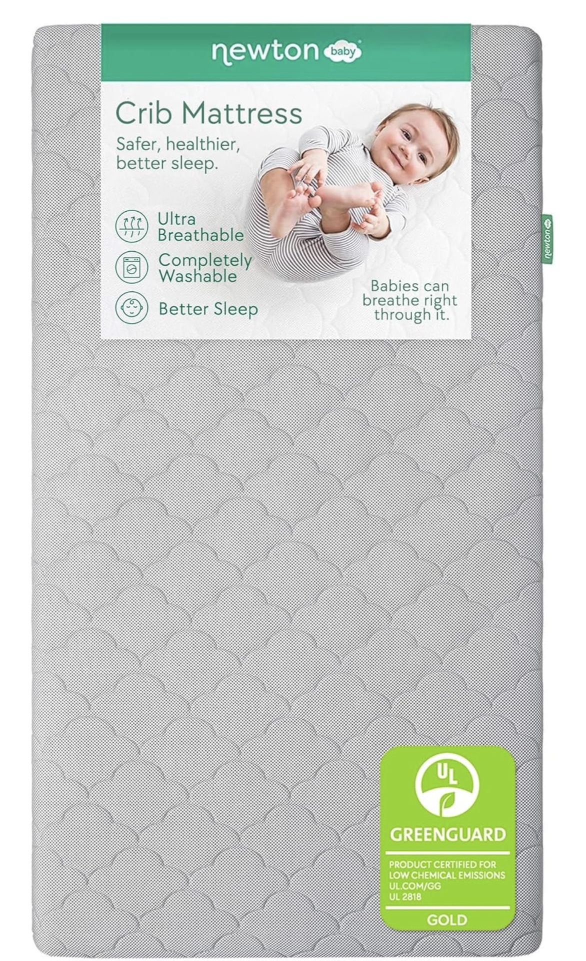 Color: Grey No Smoking Household Baby never slept in bed Details * Fully breathable, washable, and recyclable Wovenaire®core * Waterproof lining on toddler side * 2-stage design with longevity through toddler years * GREENGUARD Gold Certified * Firm enough for your baby's musculoskeletal development & comfortable for longer sleep * Tested to meet Australian Firmness Standard * Meets all ASTM and CPSC standards * Lead & phthalate free. Free of vinyl & PVC Fits all Standard American cribs * Standard Dimensions: 52" x 28" x 5.5" (LxWxH) * Standard Weight: 14 lbs. Mattress Includes * Breathe-thru outer cover - quilted dual-layer cloud pattern, made from cushiony spacer material (polyester)with TPU waterproof barrier on one side for ease in toddler years * Viscose inner cover (encasement) - safe alternative for exceeding rigorous federal flammability standards * Wovenaire® core - made of safe, food-grade polymer ( same material as a yogurt container!)