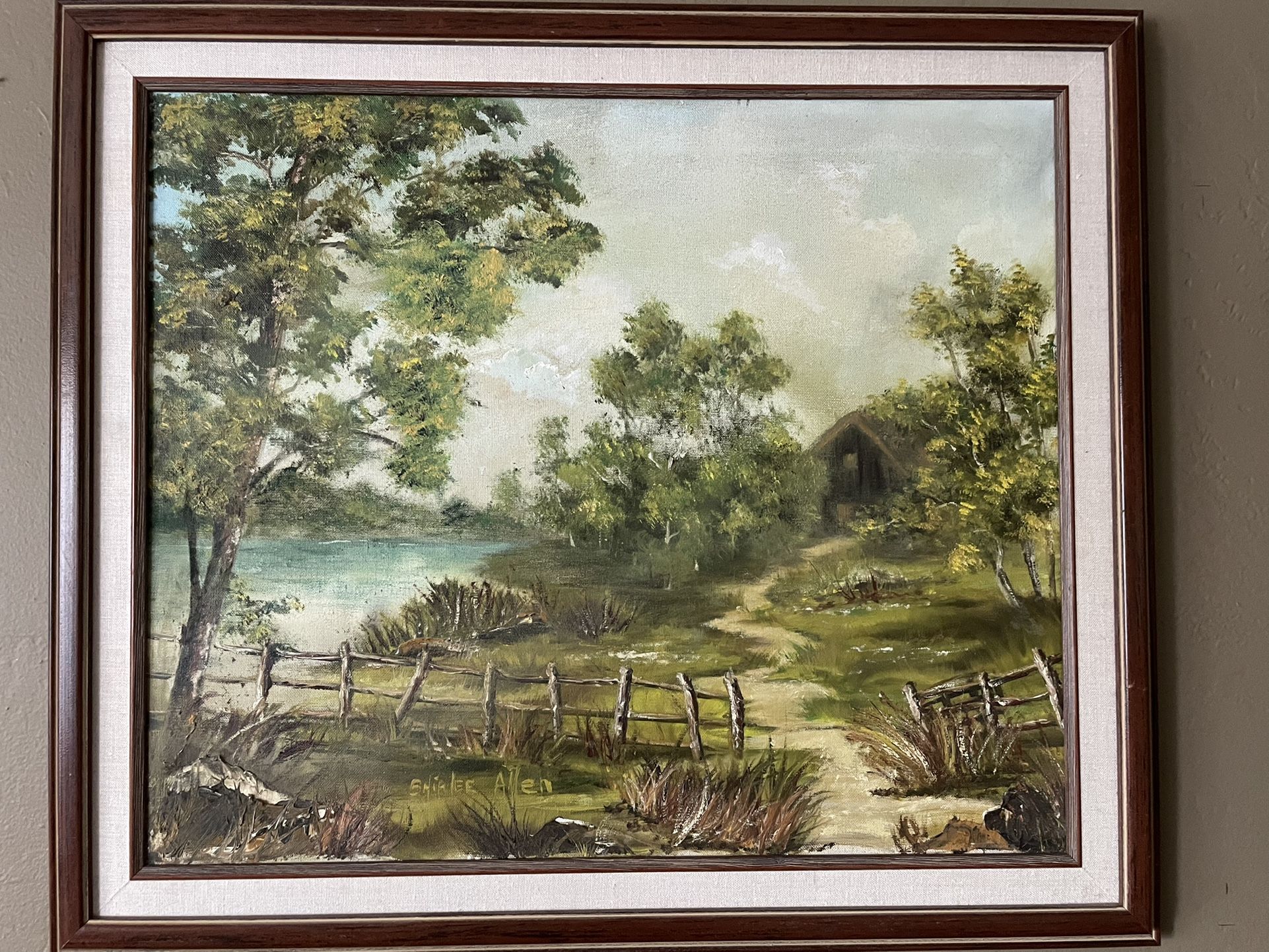 Cabin by the River, Oil on Canvas original art signed by Shirlee Allen. Professionally framed, Wood frame measures 29”Wx25”H.