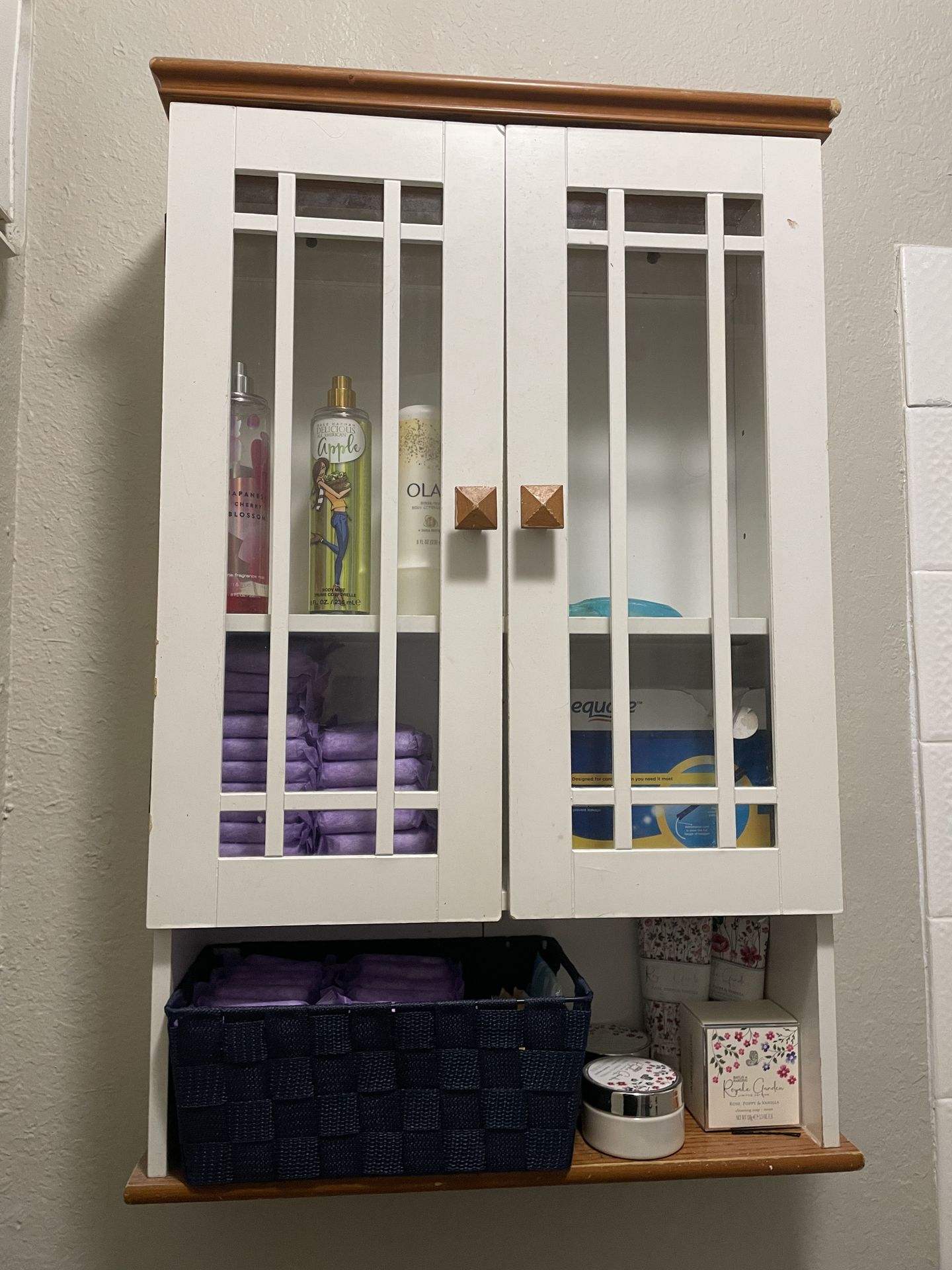 Gabinete de pared color blanco con puertas de vidrio y una moldura superior de madera, se puede usar tanto para el baño como para la cocina, tiene de medidas: 30’ de alto, 19’ largo y 6’ ancho.