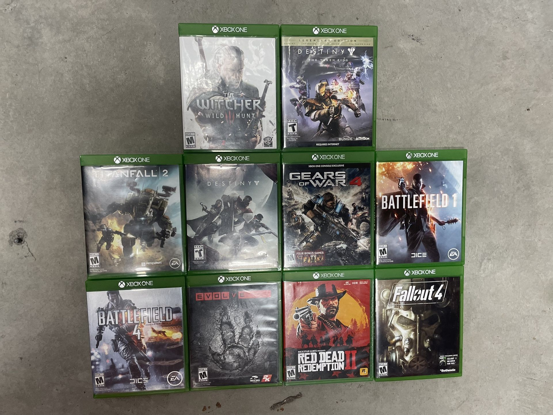 $15 each or all for $115 Witcher Wild Hunt Destiny The Taken King Titanfall 2 Destiny Gears of War 4 Battlefield 4 Evolve Red Dead Redemption 2 **SOLD** Fallout 4 **SOLD**