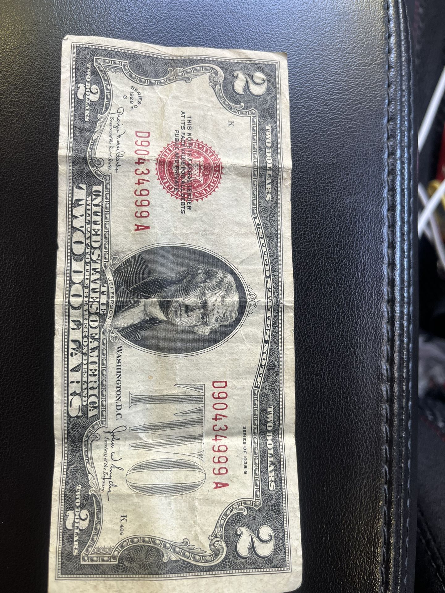 1928 2 Dollar Bill Red Writing And 1995 2 Dollar Bill