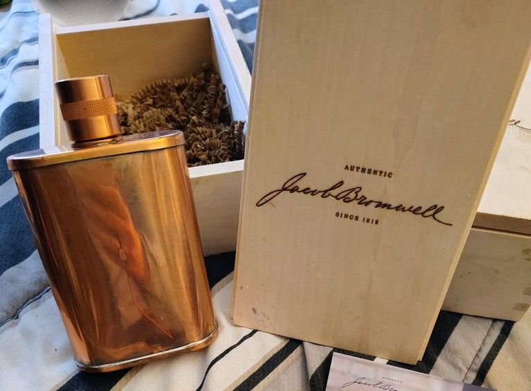 Vermonter® flask 9oz and wood presentation box - $100 each Great Holiday gifts. These flasks are heirlooms and keepsakes. I have 5 flasks total. If all 5 are purchased the price is negotiable. As seen in Men's Journal, Men's Health and US Weekly... "Masterfully hand built for more than 200 years, nothing beats the meticulous details, balanced weight, in-hand comfort, and feel of Vermonter®: the world's most iconic flask at a generous 9 oz. capacity that's perfect for everyday carry. The flask of choice for Hollywood stars, business magnates, professional athletes, and several U.S. Presidents, its body is made of 22 gauge solid copper—finished off with our ultra-reflective SuperPolish™ finish—while molten, lead-free tin is applied to the interior using a lost process that's trade-secret to our company." https://offerup.com/redirect/?o=V3d3LkphY29iYnJvbXdlbGwuY29t Imperfectly Perfect: Minor imperfections lend charm, depth, and individuality to each piece and are a natural part of the 100% handmade process. Embrace the imperfect. This is the Jacob Bromwell® way. $350.00 each from the website and are always sold out. There is Waiting list for most of their handmade items.