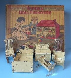 Antique "Steel Doll Furniture" manufactured by Chicago Ferrul & Nut Co. Furniture representing a bedroom and nursery pieces, in very good condition structurally but the paint is badly flaking off. Bed is 4" long, dresser 3" wide, chair and rocking chair both 4 1/8" tall, cradle is 2 1/2" long, high chair is 2 7/8" tall. Box is 11 3/4" long, 9 3/4" wide, 3" deep. In very good condition for its age. Split on one corner. Graphics on the box around 1920.