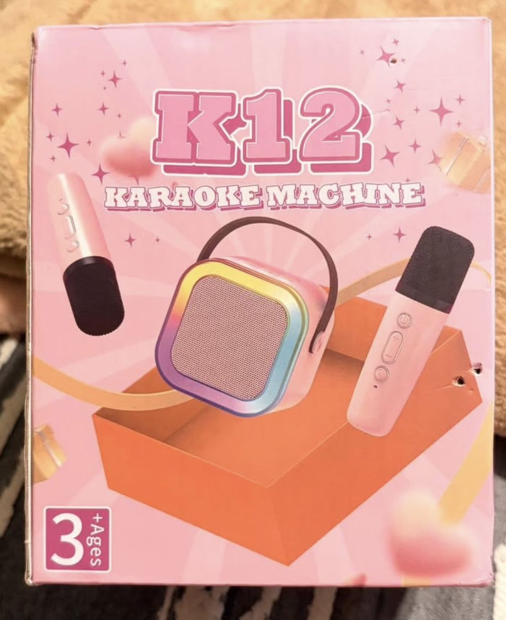 Portable K12 karaoke machine in pink with rainbow-trim speaker and two pink microphones. Cute, compact design. Fun for parties and kids.