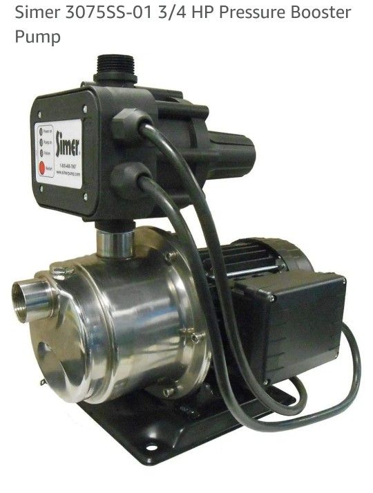 Simer 3/4hp water booster pump. Used for a year. Sold house. Copper pipe and fittings not included. Will sell separately if needed. Local pickup only.