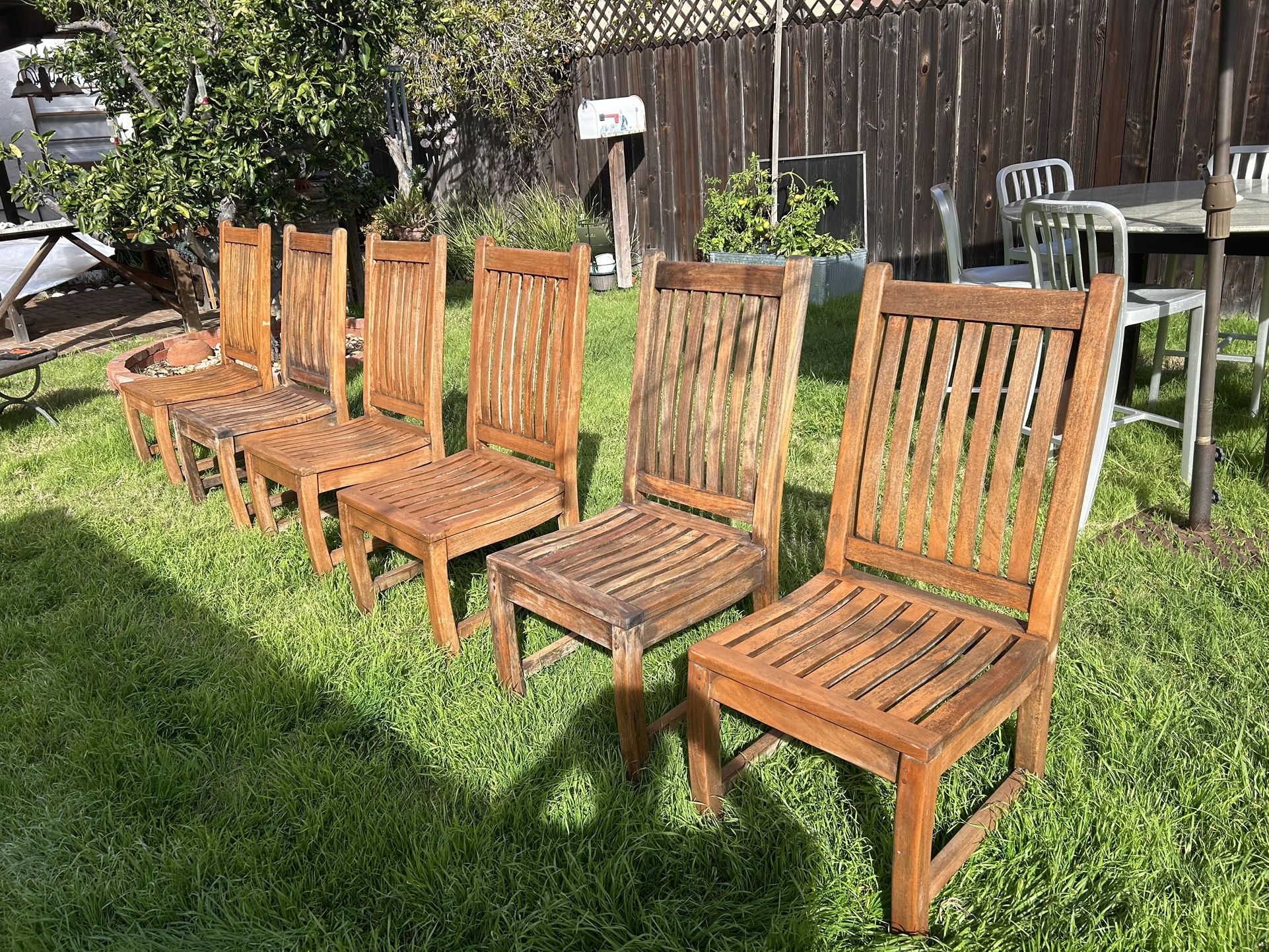 Three different sets of used Teak Chairs. First is a set of 6. Excellent condition. Oiled fairly recently. Very solid chairs. See the ad for these chairs new at “The Original Wood Joy” site on sale for $493 each. (https://offerup.co/faYXKzQFnY?$deeplink_path=/redirect/). Priced at $600 for the set. Selling as a set unless I get multiple requests for pairs. Second set is 2 stackable, lighter. Very good condition. $100 for the pair. Third set is 2 armchairs, a little older but lots of life left in them. $50 for the pair.