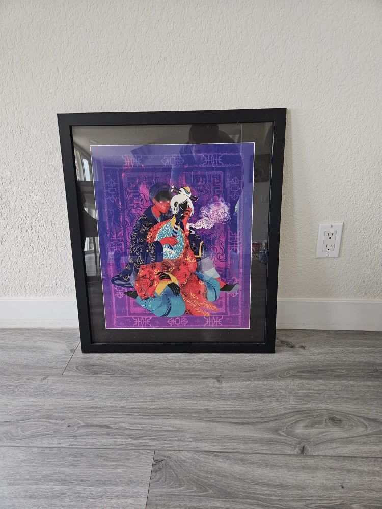 Elevate your decor with this beautifully framed, highly detailed illustration. The work features two figures in traditional-style attire, set against a rich purple and neon-patterned backdrop. With its blend of cultural aesthetics and modern graphic style, this piece is a conversation starter. Comes fully framed and ready to hang. Pickup in carlsbad