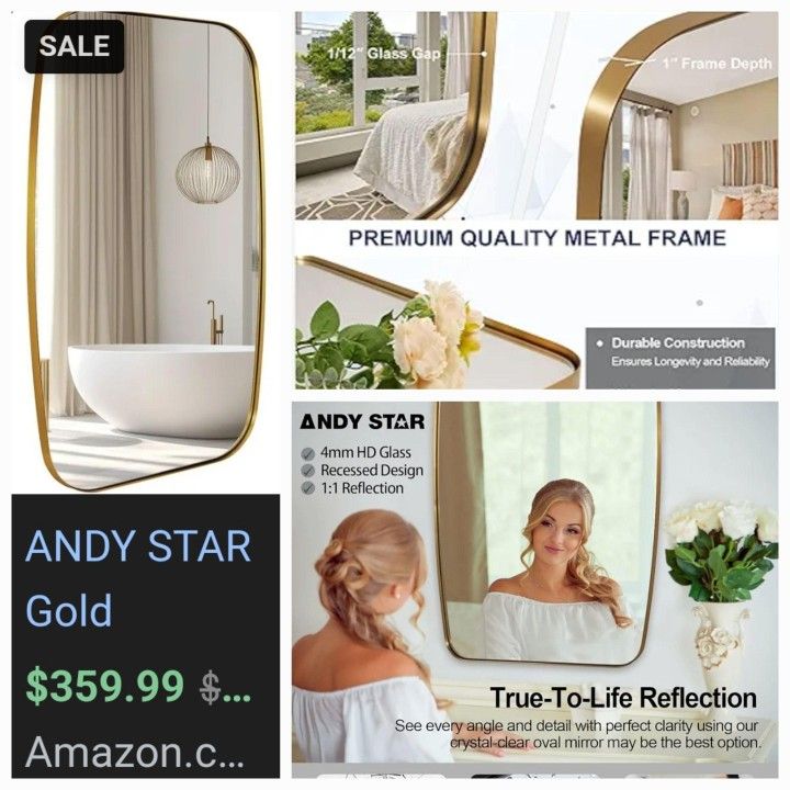 0784: BRAND NEW ANDY STAR Gold Bathroom Mirror, 20x30’’ Brushed Gold Vanity Mirror for Bathroom, Brushed Brass Oblong Stainless Steel Metal Frame Mirror for Over Sink Brand: ANDY STAR Room Type: Bathroom, Bedroom, Living Room, Powder Room Shape: Rectangular Product Dimensions: 30"L x 20"W Frame Material: Stainless Steel Style: Modern Excellent Performance: A sleek, modern stainless steel metal frame surrounds a unique oblong mirror; sets it apart from traditional oval or rectangular mirrors; brushed gold finish complements your bathroom; adds light and space to the room Maximize Limited Wall Areas: Maximize your bathroom's wall space with the 20 x 30 inch mirror. Its versatile size and clear, distortion-free reflection make it perfect for narrow spaces, offering both practicality and aesthetic appeal in confined areas Premium Quality: Crafted from heavy-duty SUS304 stainless steel, this oval mirror is sturdy, durable, anti-scratch, and rustproof; The no-distortion HD glass provides clear reflections; the MDF backboard ensures safety and strength against humidity True Reflection: This vanity bathroom mirror features a 4mm HD glass surface, delivering flawless, distortion-free reflections. Its scratch-resistant and shatterproof design ensures durability, while the easy-to-clean surface maintains a perfect shine with minimal effort Expert Craftsmanship: We pay attention to detail and maintains strict quality control; from material selection to manufacturing techniques; each oval wall mirror is crafted to five-star hotel standards; over 50 steps of processing ensure quality (GM)