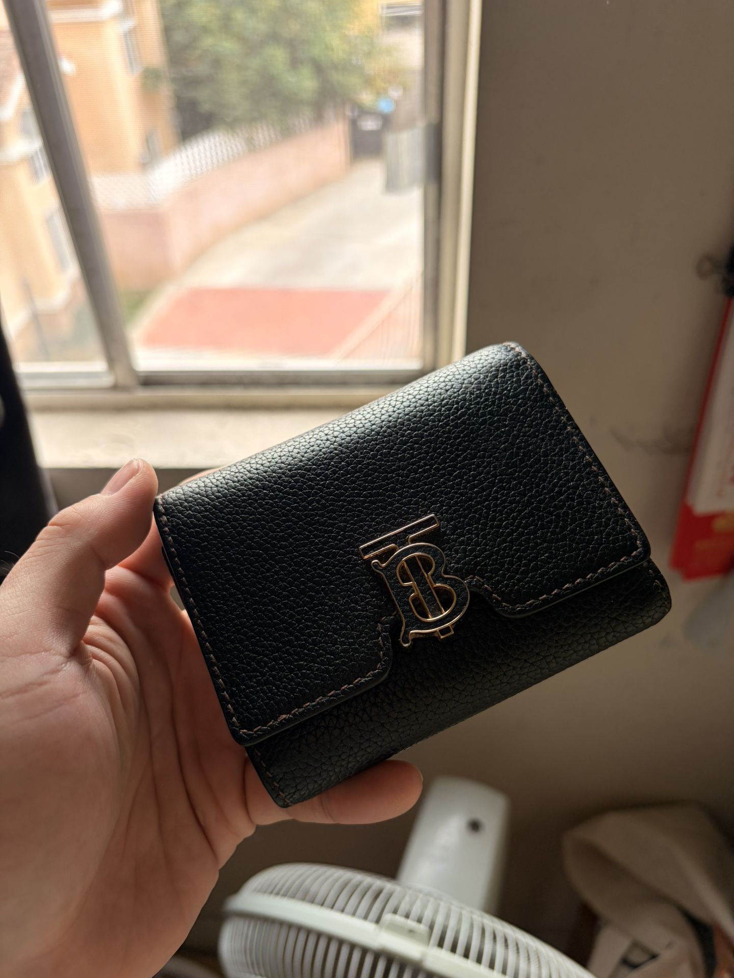 Elegant black wallet. Features gold logo detail. Compact and stylish, the Wallet can put many cards many coins or cash. Burberry Black Real Grain Leather Folding Wallet with Gold Logo TB, I bought it from a good seller, very rarely use, I use high end leather condition to clean and keep the leather just like new .