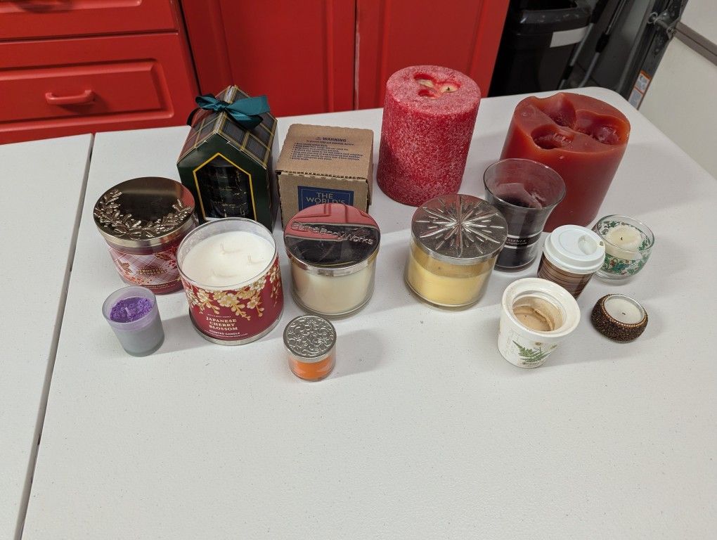 15 candles / candle holders for sale. 7 of them are unused. $5 each - Bath & Body Works 3-wick Japanese Cherry Blossom (4 of these) $3 used BBW 3-wick Champagne Toast, $1 - BBW mini Mango Dragon fruit $3 Serene Snowfall, new in box Used candles $1 each (except champagne toast) Buy separately or all for $30