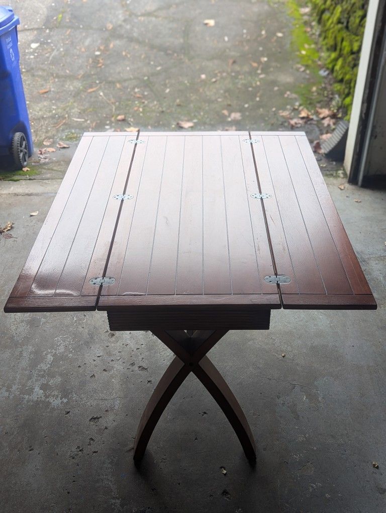 Dimensions: 50"x20"x30", 50"x40"x30" extended. Simple desk with no drawers. All wood with metal fastenings. Good condition but could use some tightening up and a refinish.