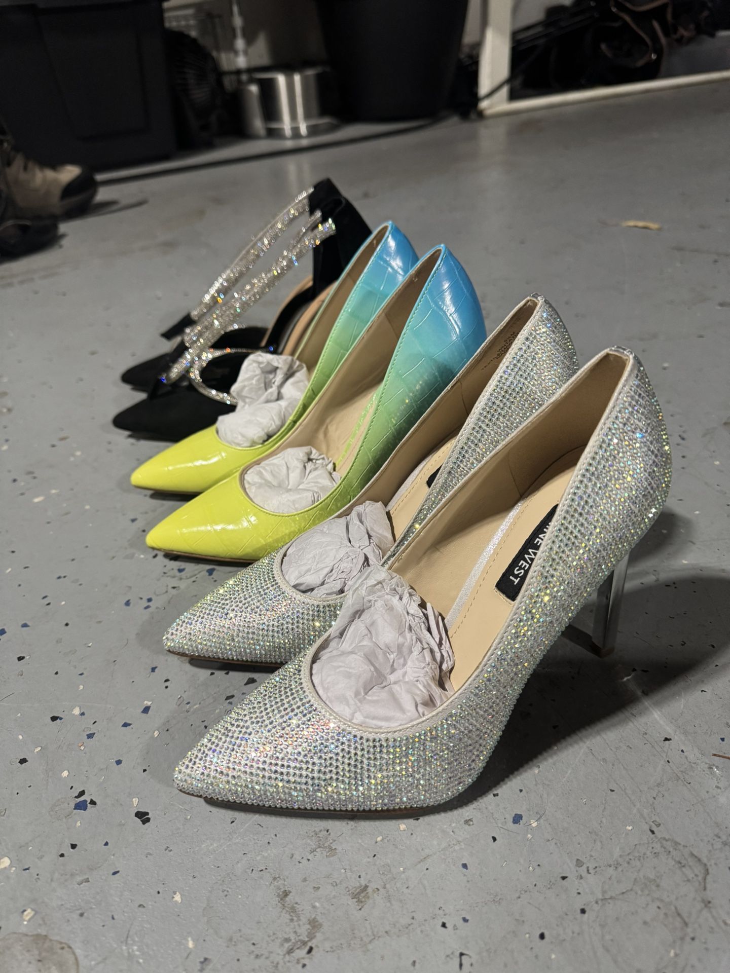 The yellow greenish pair is brandnew. Never wear! The blink blink pair was worn once for my wedding. The black was never worn as well. Pick up all!