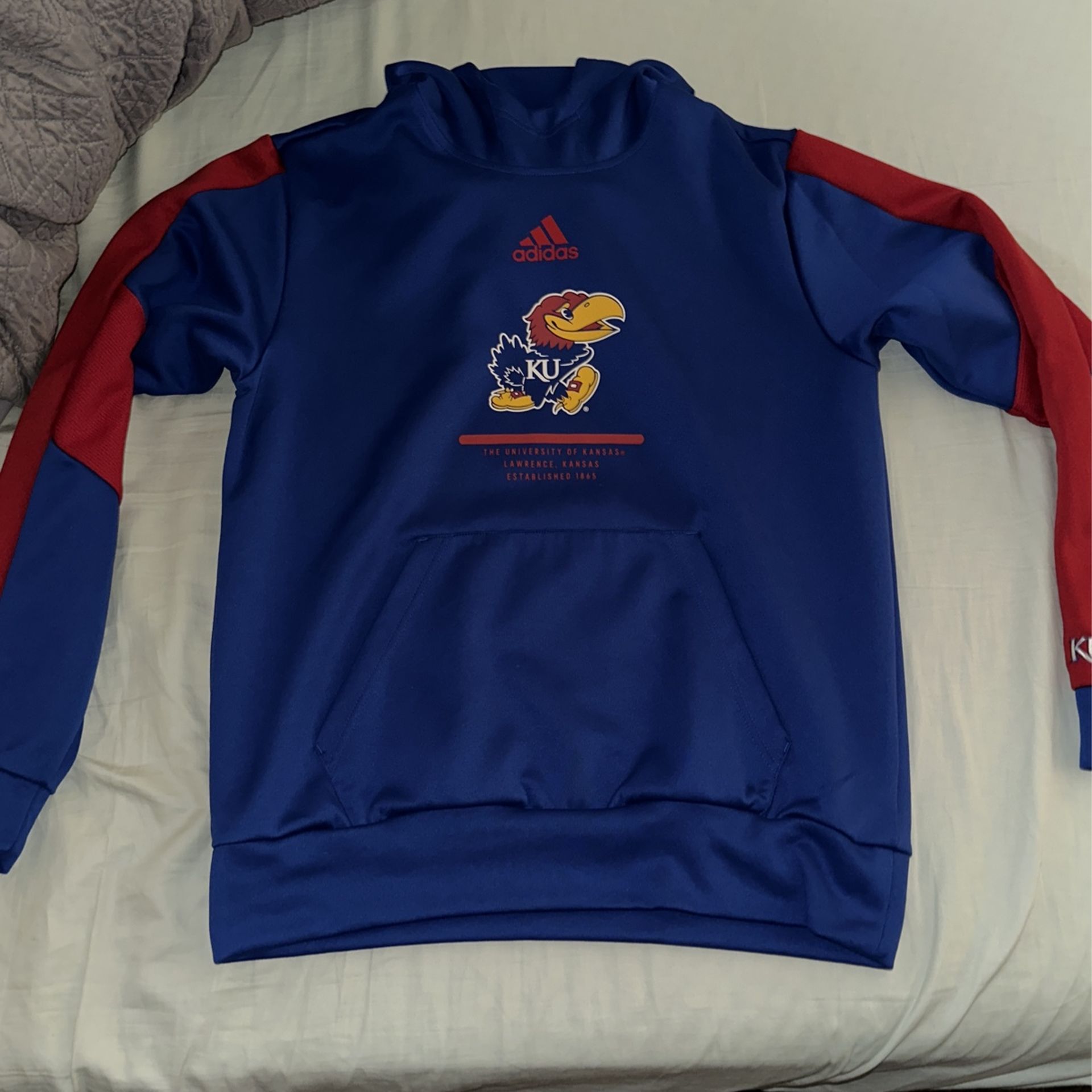 Kansas University hoodie, just getting rid of clothes. Brand new has only been worn a couple times it’s a good buy no rips or tears basically brand new
