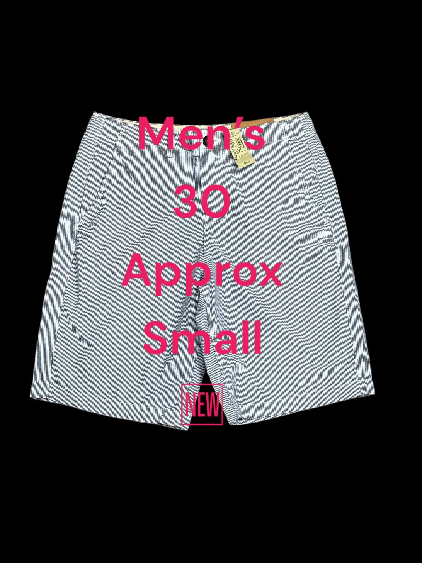NWT New With Tags Men’s AEO American Eagle Outfitter 30 Approx Small Shorts Khakis Chinos Lightweight Nautical Boat Classic Falls Just below the knees Pin Stripe Light Blue & White Flat Front Casual Golf Athletic Dress Activewear 10” inch Inseam 15” inches flat across Waist Perfect Size 30 100% Cotton 4 Pockets No Visible Stains, Holes, Or fabric Distressed- This is perfect New Condition 7/3/23 Bin 25 11oz