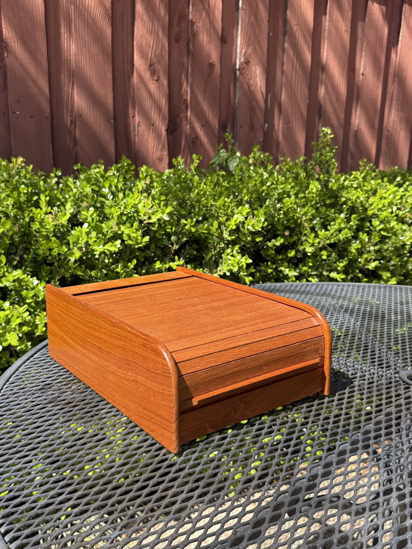 This is a beautiful vintage Teak wood desk organization box with a tambour sliding cover that opens to reveal divided compartments. Perfect for business cards, as a file for those old Rolodex files, or as a catch all for modern day non luddites who need a box for all of their desktop tech gadgets. Whether you love to hide your mess or keep everything perfectly organized but hidden from view, this teak box is the answer made by Teak Tech made in Thailand . In very good vintage condition for its age . Measurements are : Tall 4 3/4 “ inches . Long 14 “ inches . Wide 9 3/4 “ inches . $ 55 First comes first served . Pick ip in north dallas . All sales are final .