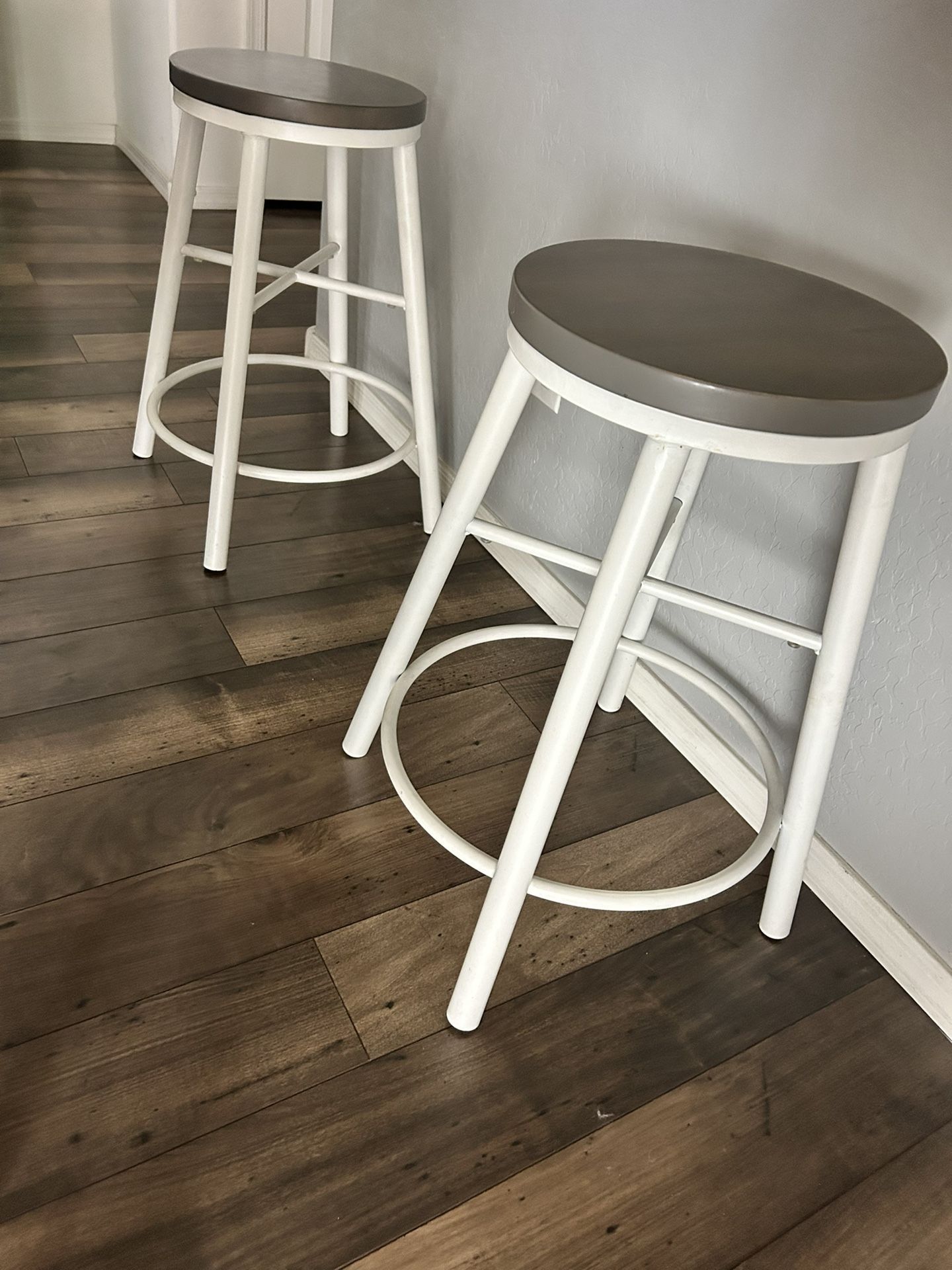 Farm style barstools, grey brown, top color, wood top/metal white legs Like new condition from target Width- About 1 ft 3 in. Height- About 2 ft. $60